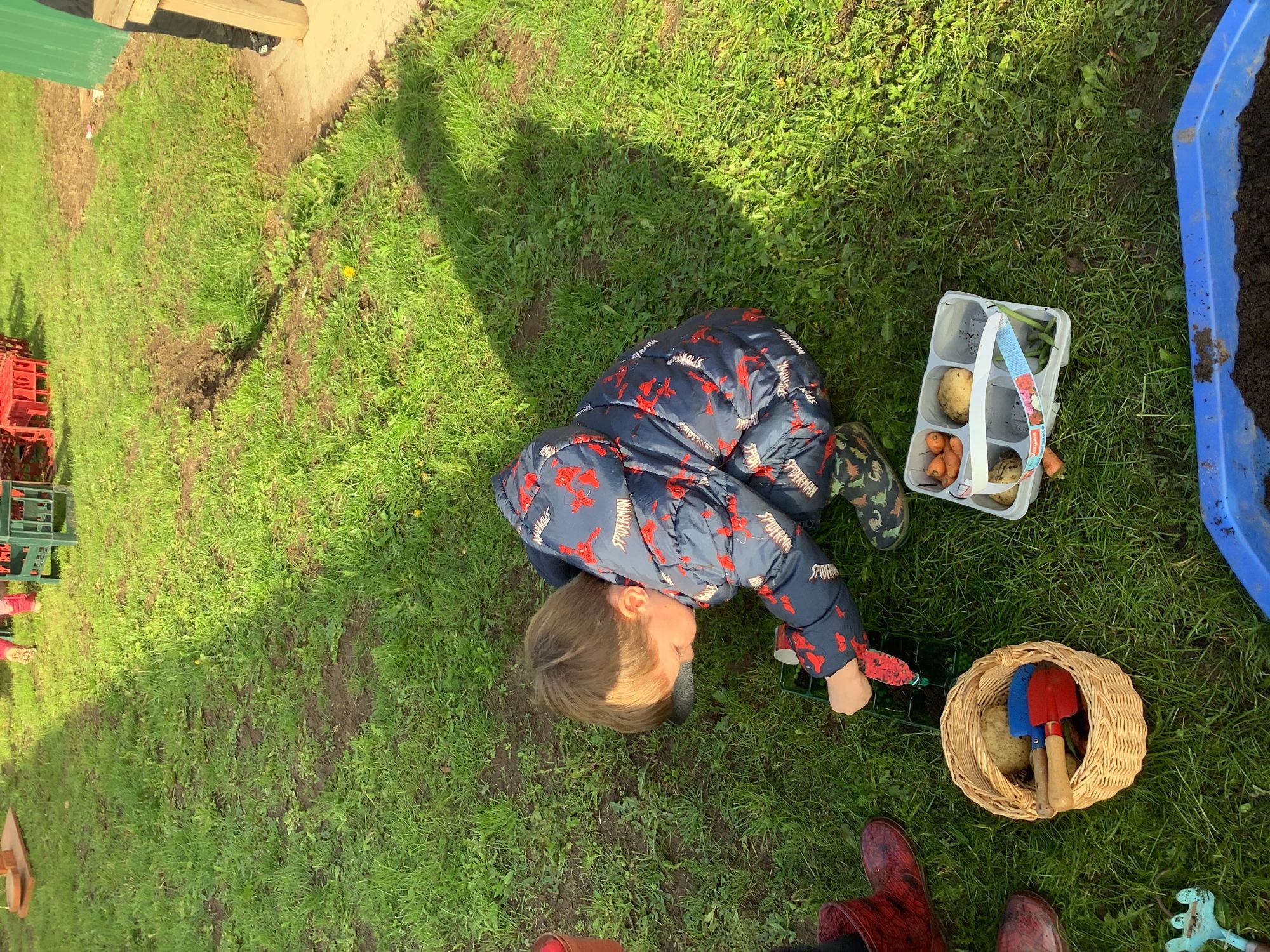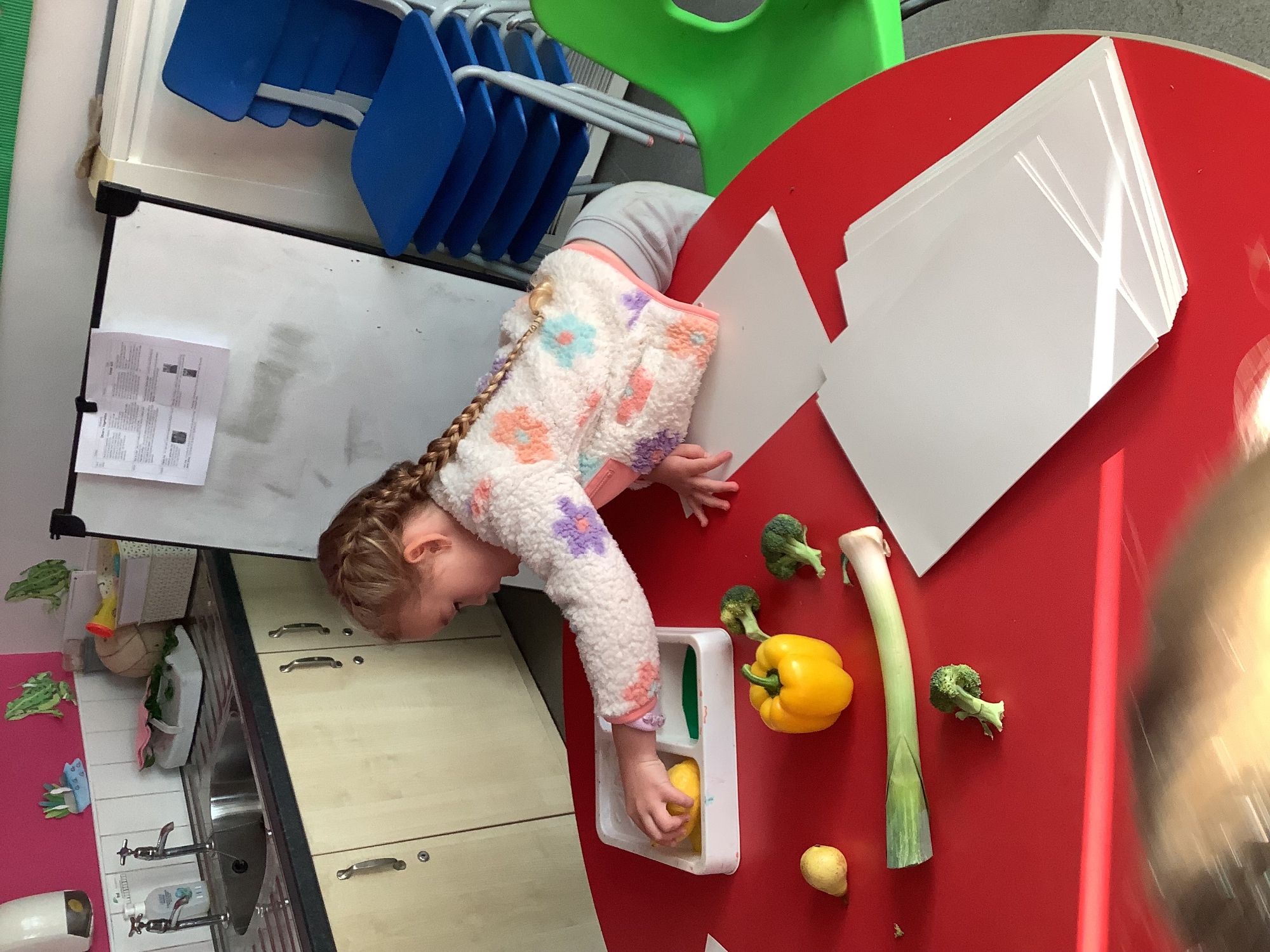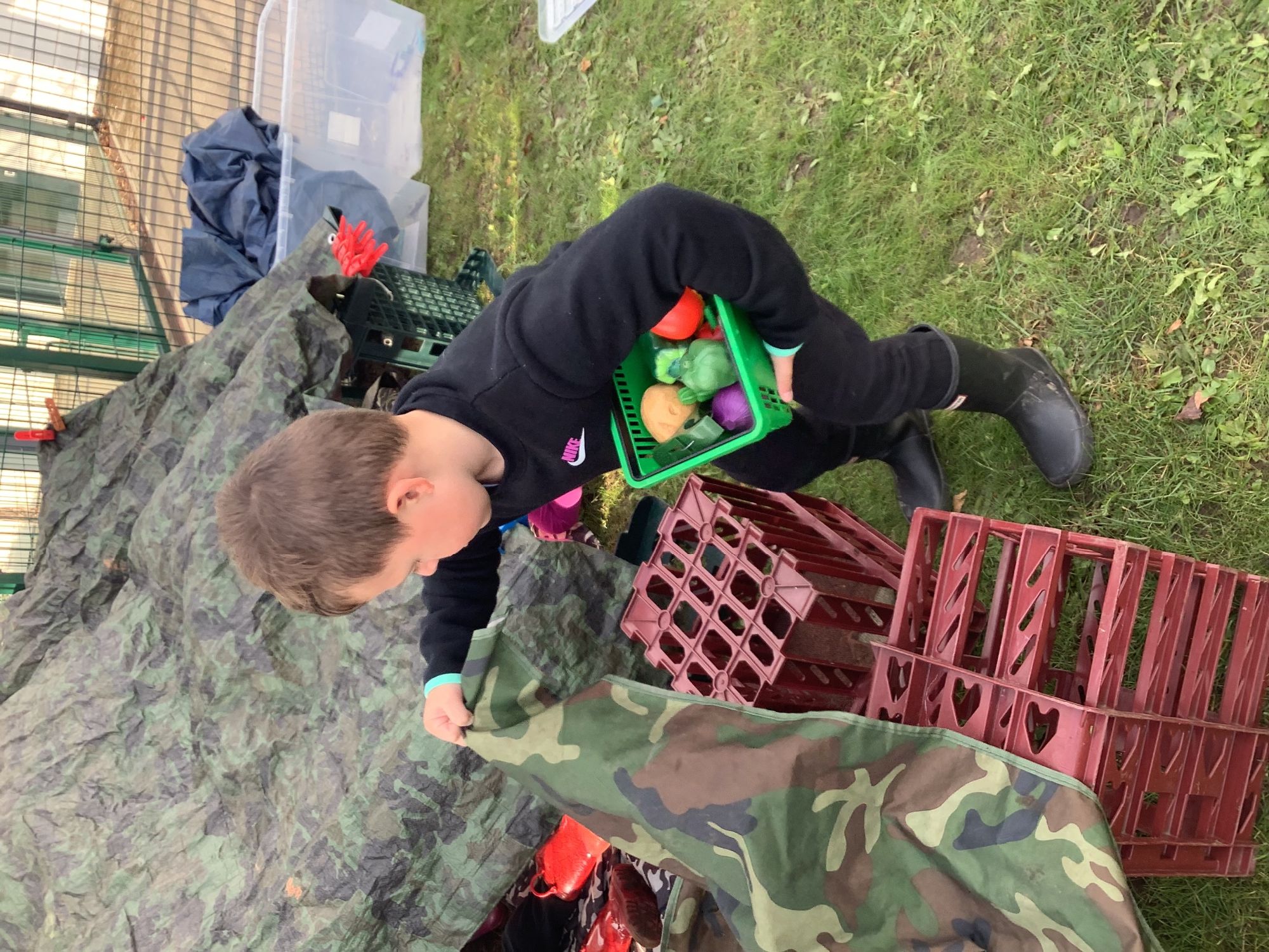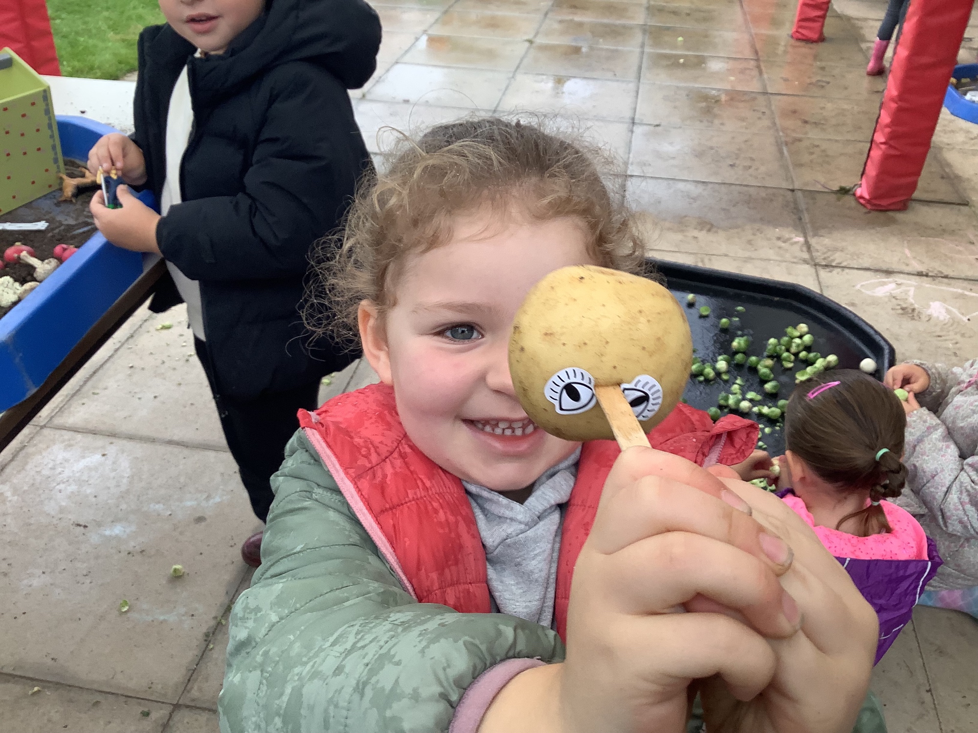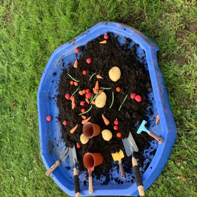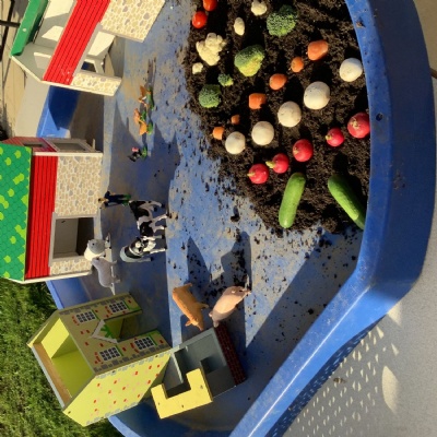 We then went outside to explore lots of activities based around the book. We harvested vegetables, weighed them to sell on our market stall, used our printing skills to create painting using fruit and vegetables, used our fine motor skills to peel sprouts, made a combine harvester out of crates, made potato people, made delicious food in the mud kitchen and enjoyed eating our fruit snacks in the outdoors. We had so much fun while so much learning was happening!