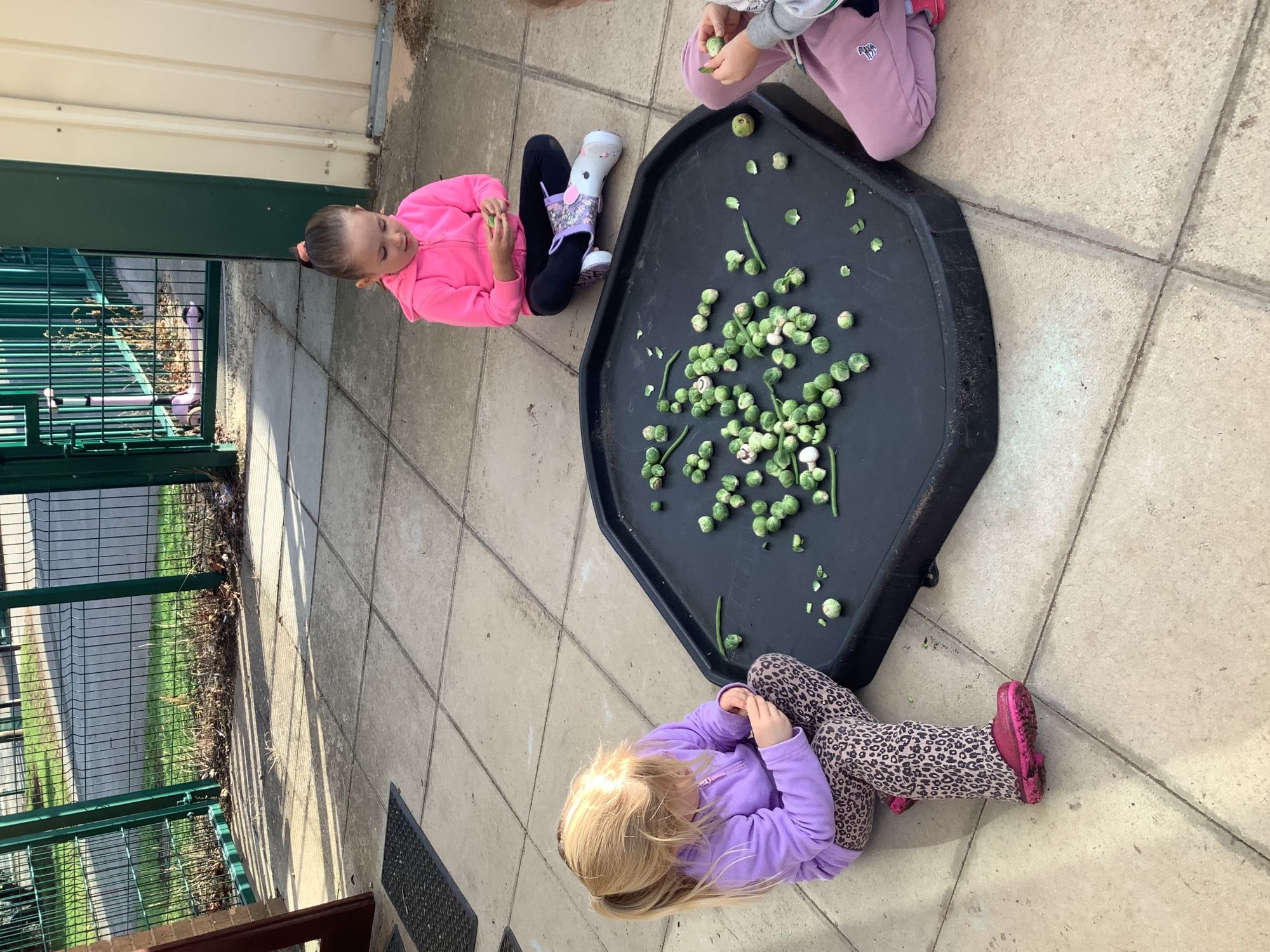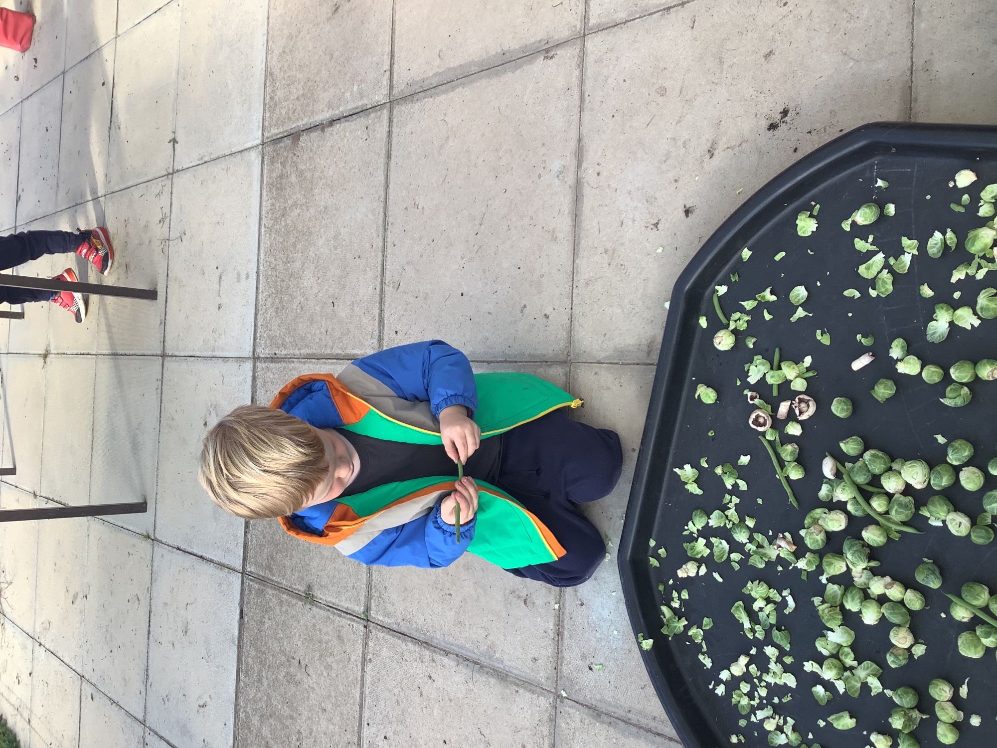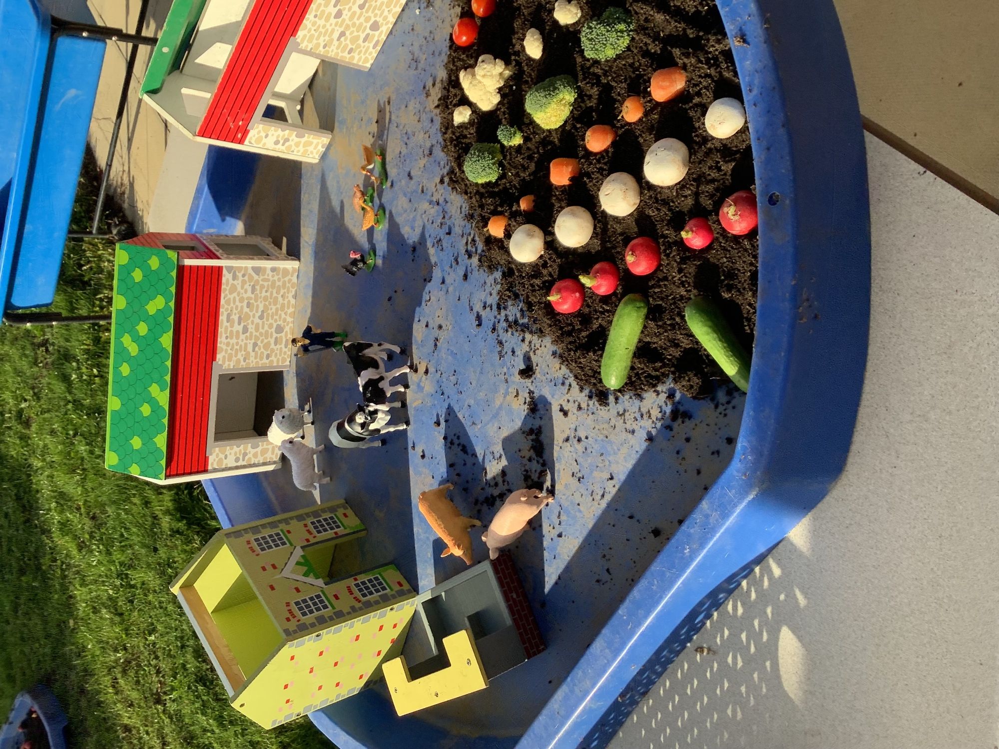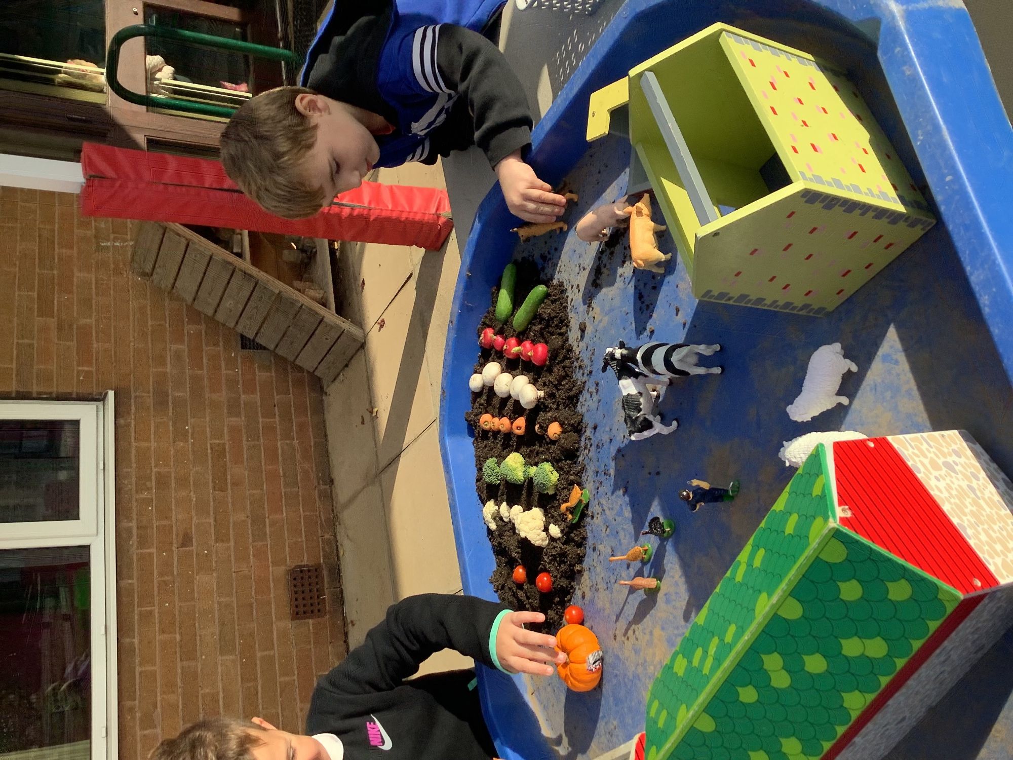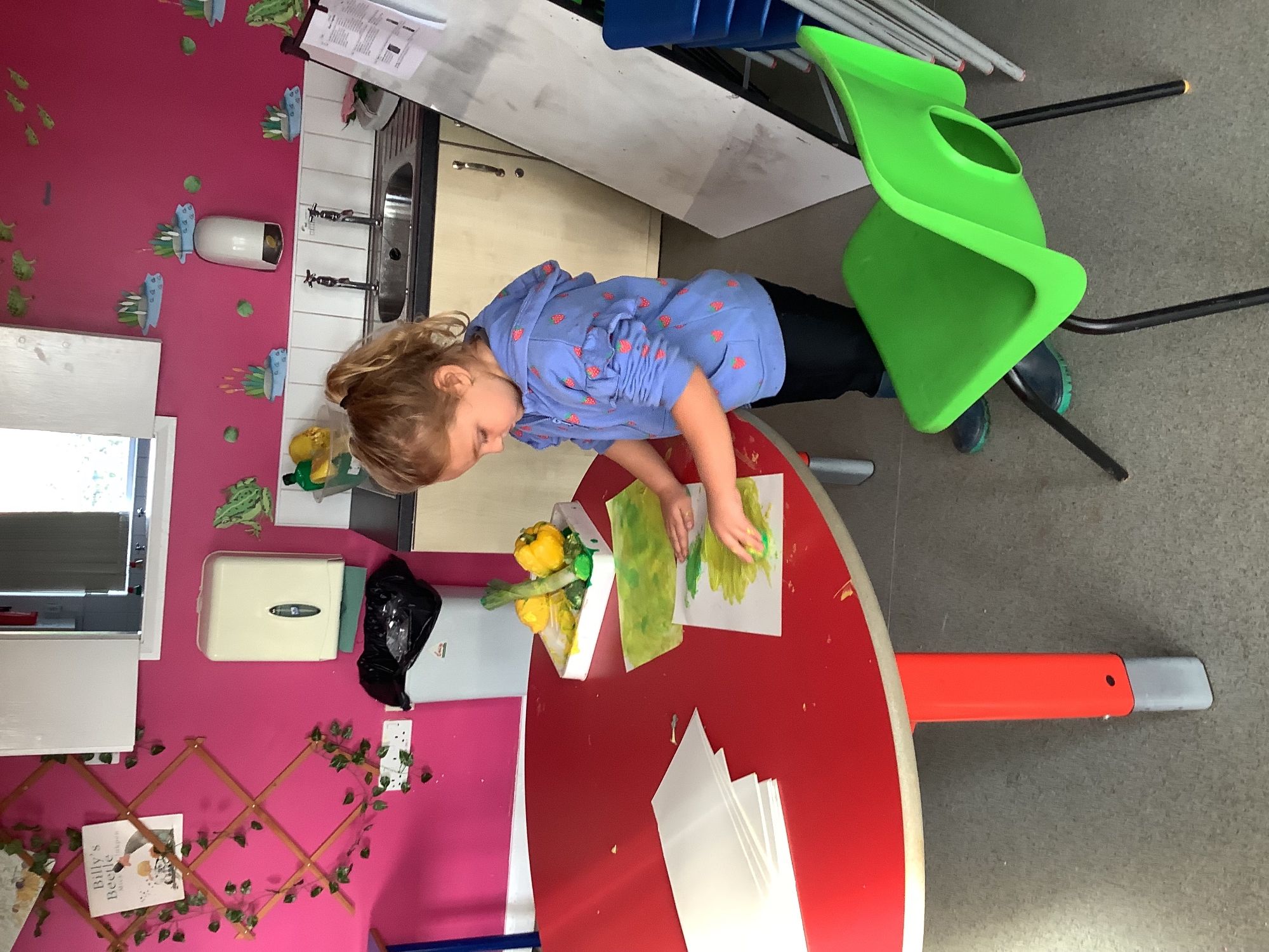 We then went outside to explore lots of activities based around the book. We harvested vegetables, weighed them to sell on our market stall, used our printing skills to create painting using fruit and vegetables, used our fine motor skills to peel sprouts, made a combine harvester out of crates, made potato people, made delicious food in the mud kitchen and enjoyed eating our fruit snacks in the outdoors. We had so much fun while so much learning was happening!