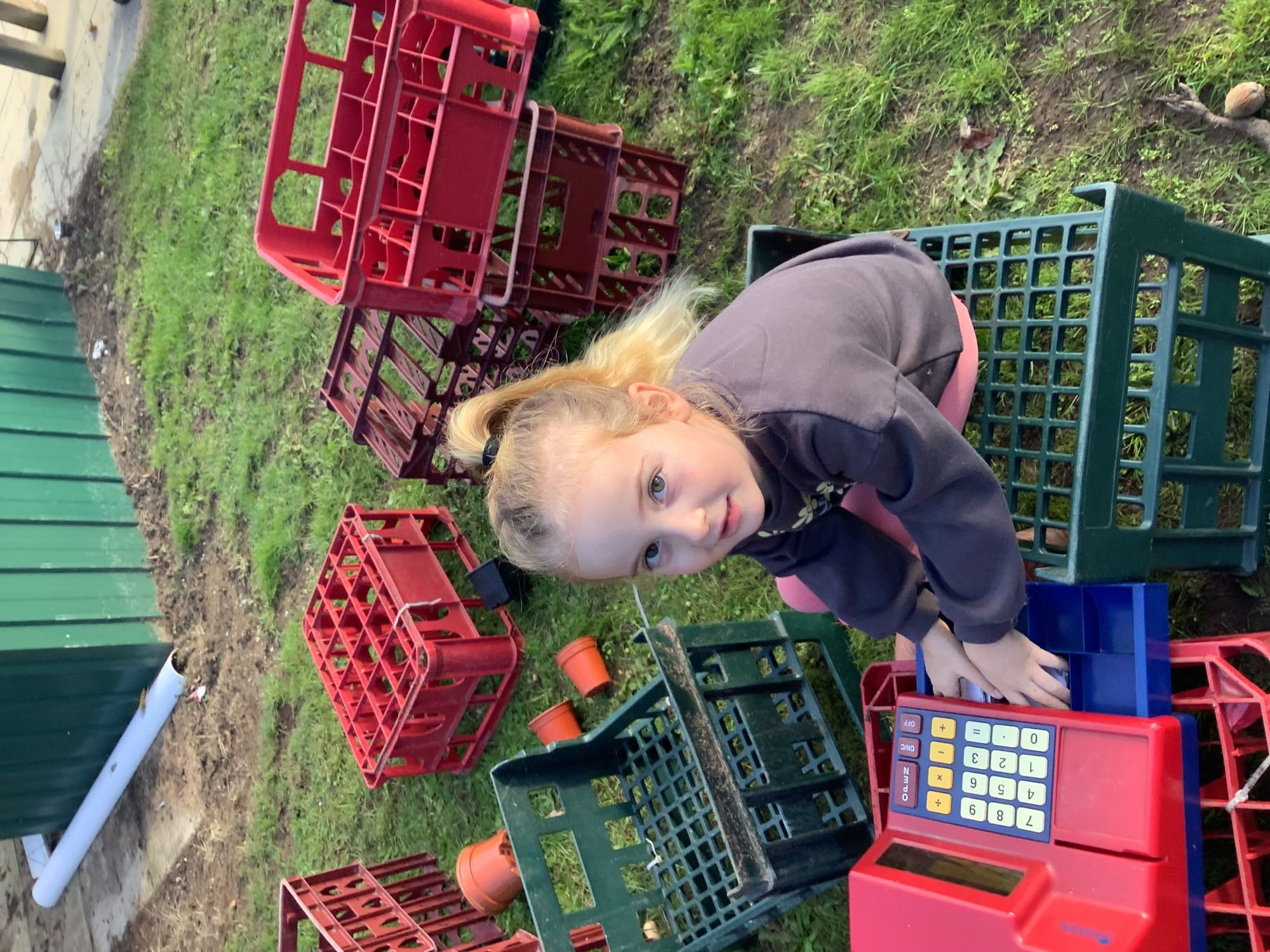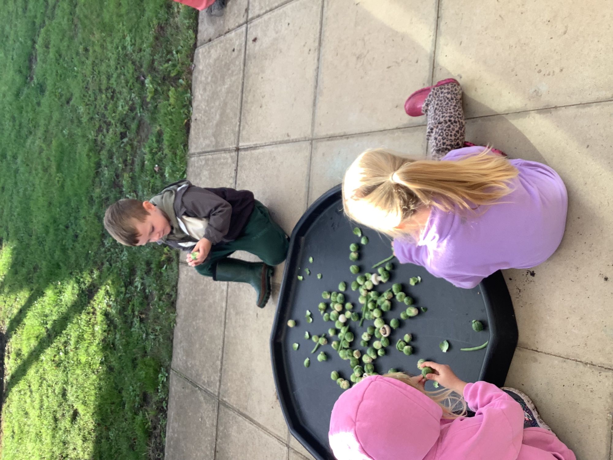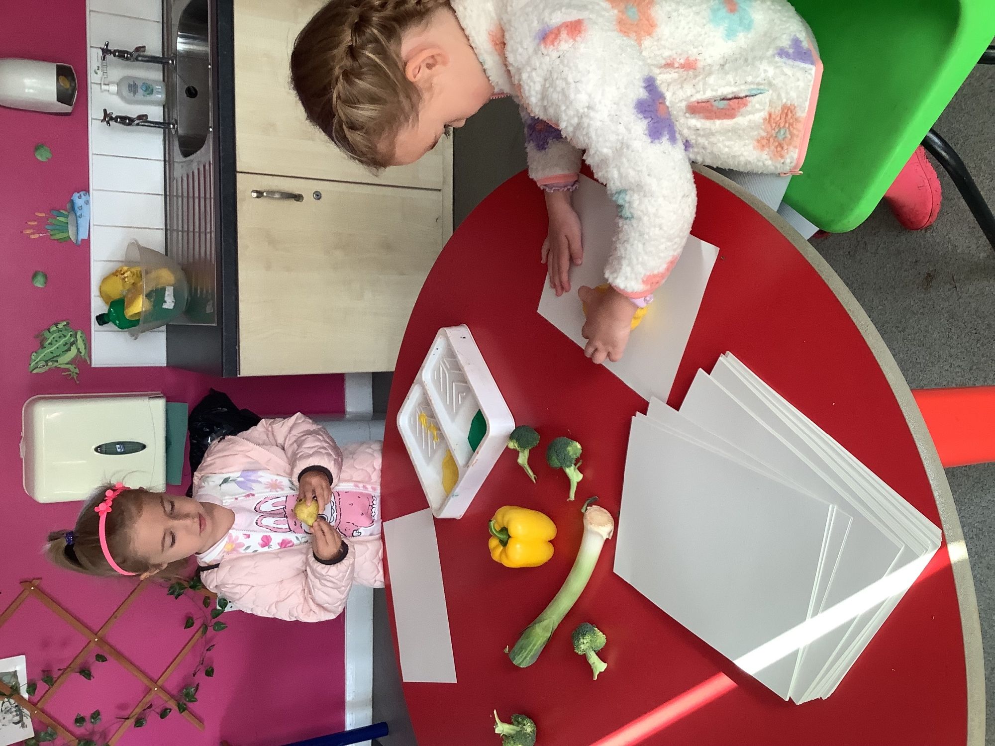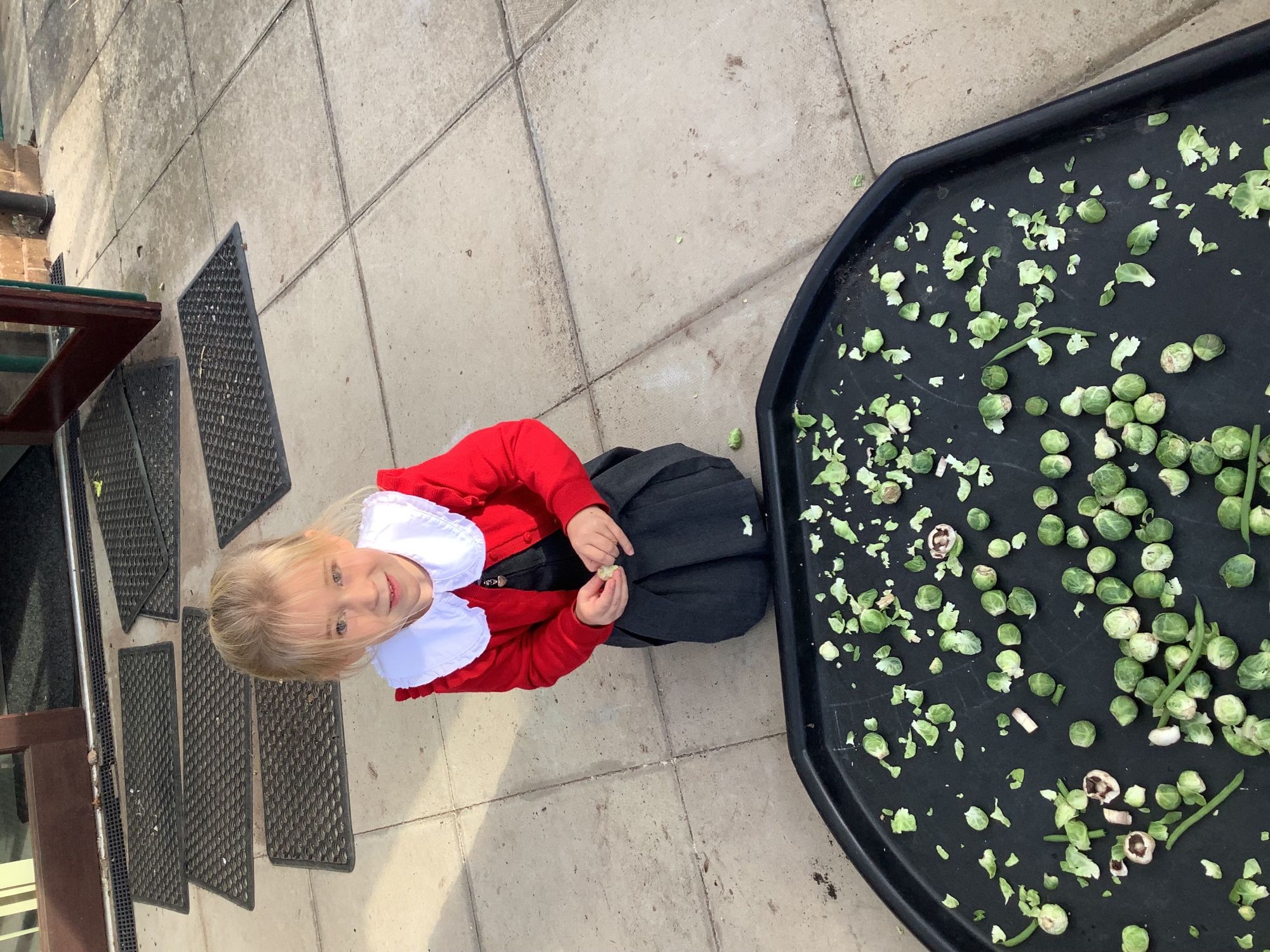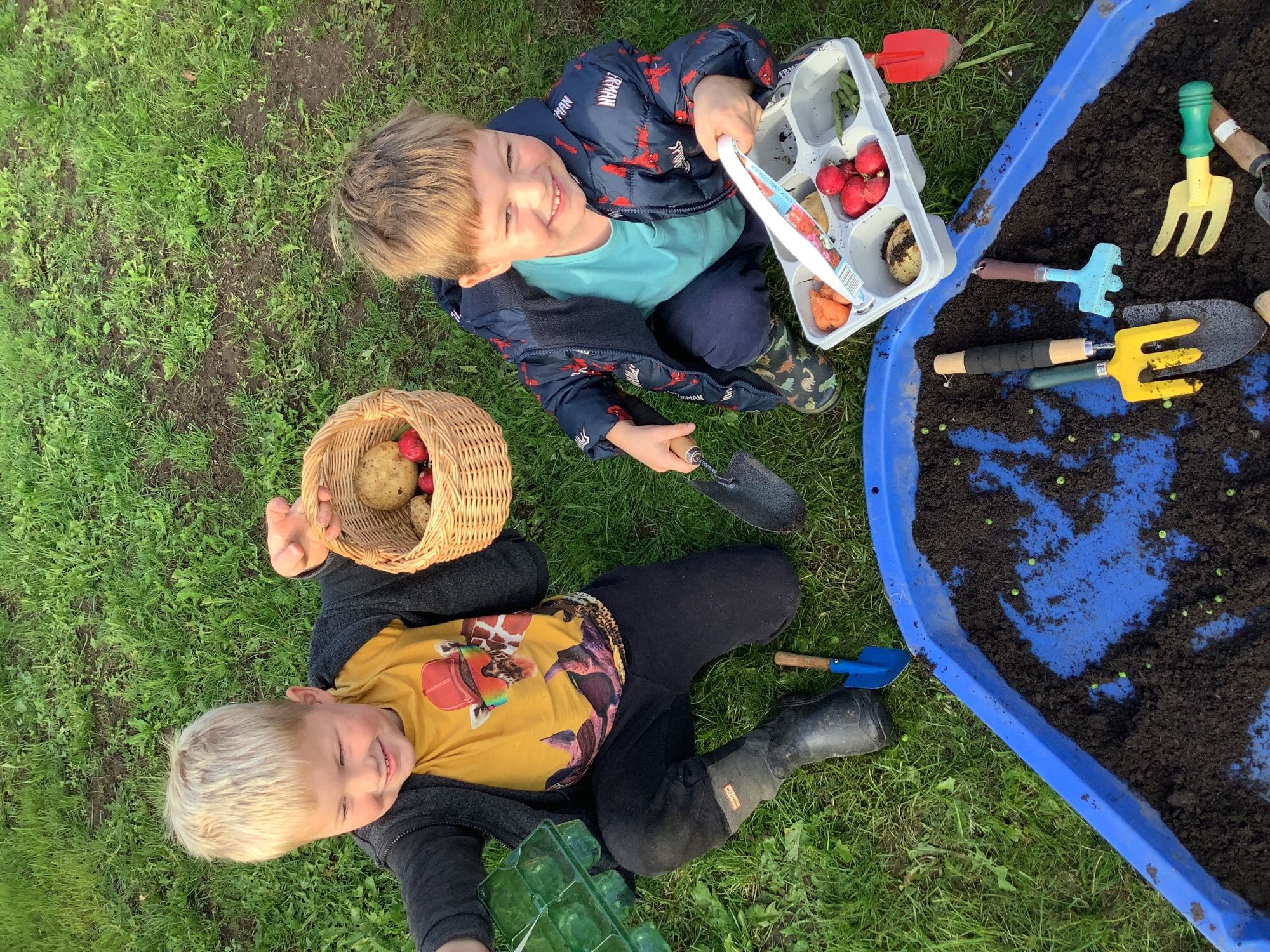 We then went outside to explore lots of activities based around the book. We harvested vegetables, weighed them to sell on our market stall, used our printing skills to create painting using fruit and vegetables, used our fine motor skills to peel sprouts, made a combine harvester out of crates, made potato people, made delicious food in the mud kitchen and enjoyed eating our fruit snacks in the outdoors. We had so much fun while so much learning was happening!