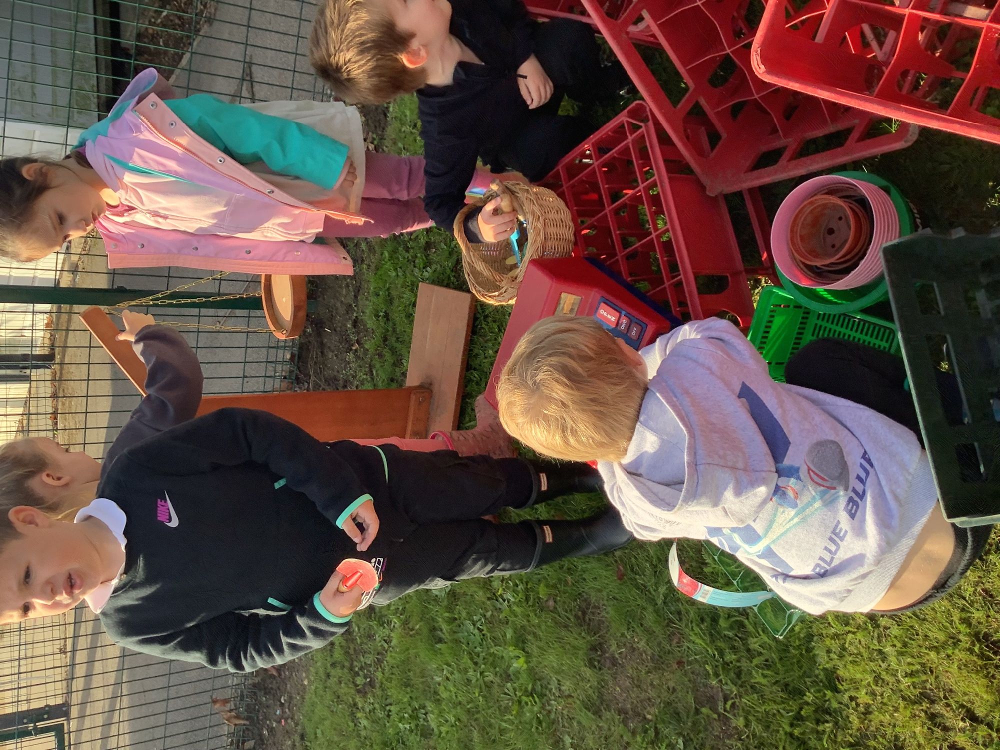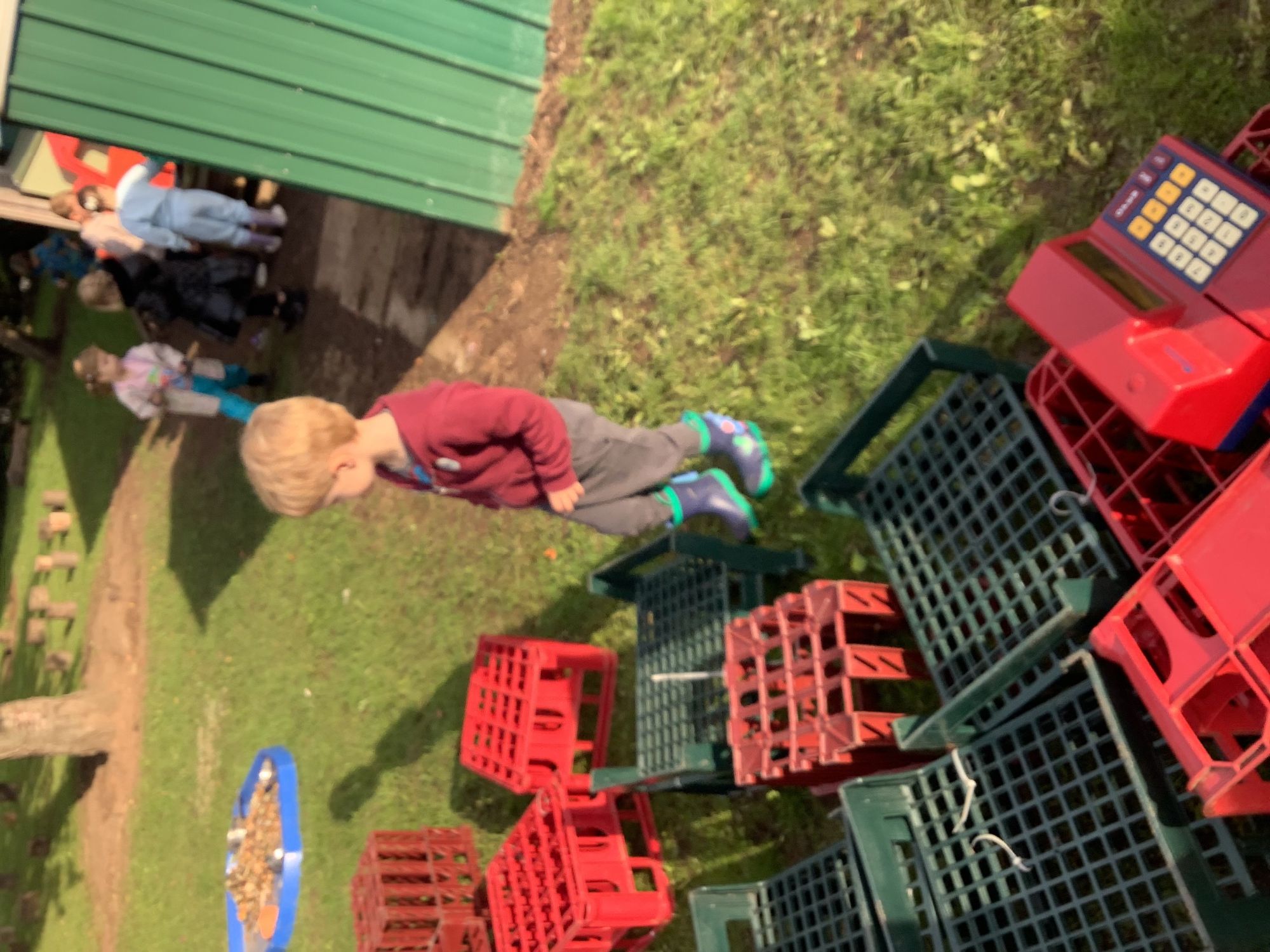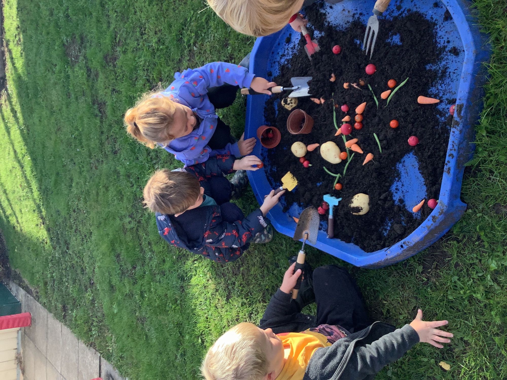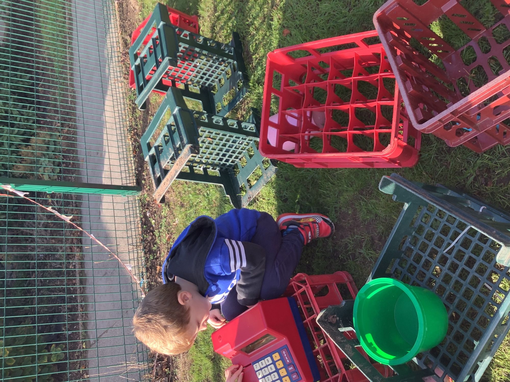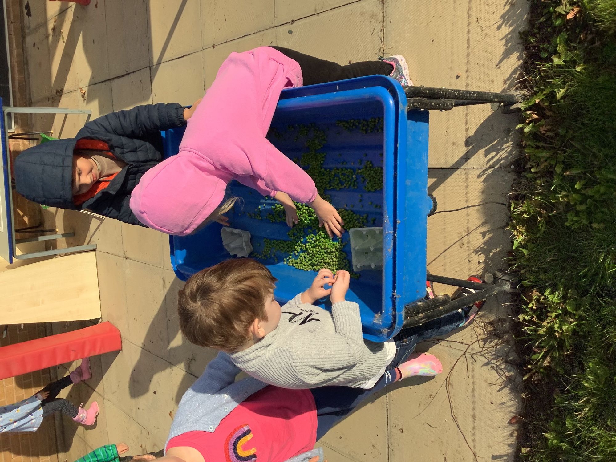 We then went outside to explore lots of activities based around the book. We harvested vegetables, weighed them to sell on our market stall, used our printing skills to create painting using fruit and vegetables, used our fine motor skills to peel sprouts, made a combine harvester out of crates, made potato people, made delicious food in the mud kitchen and enjoyed eating our fruit snacks in the outdoors. We had so much fun while so much learning was happening!