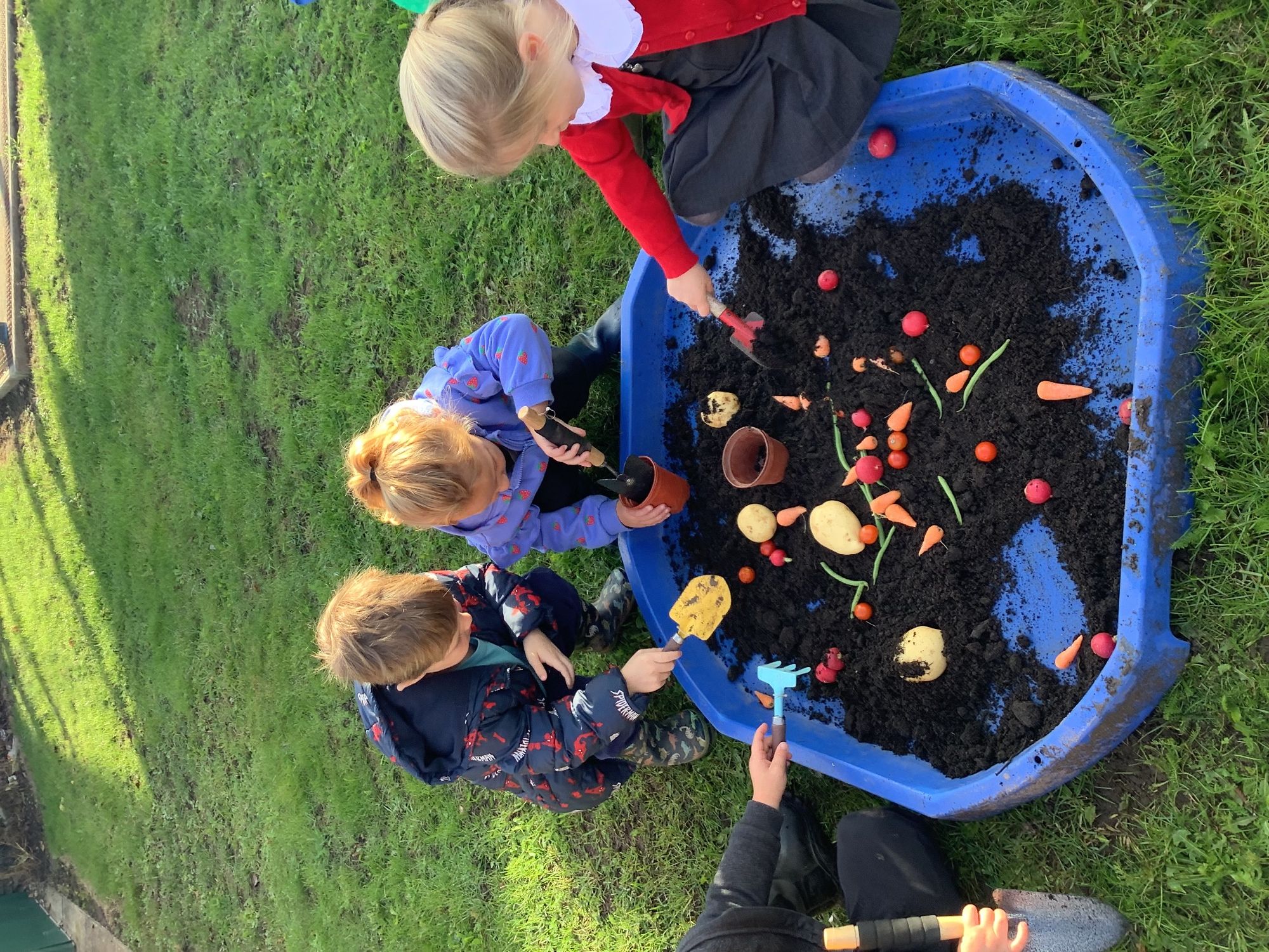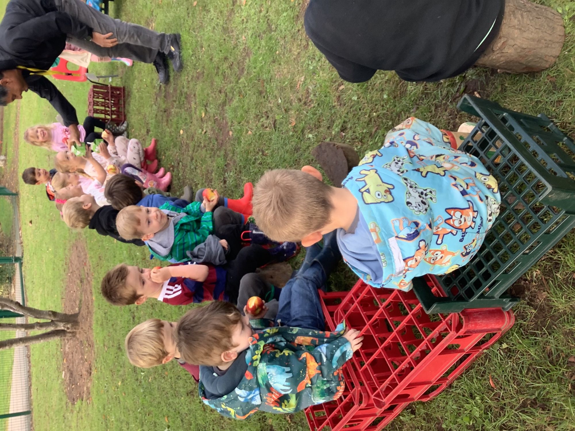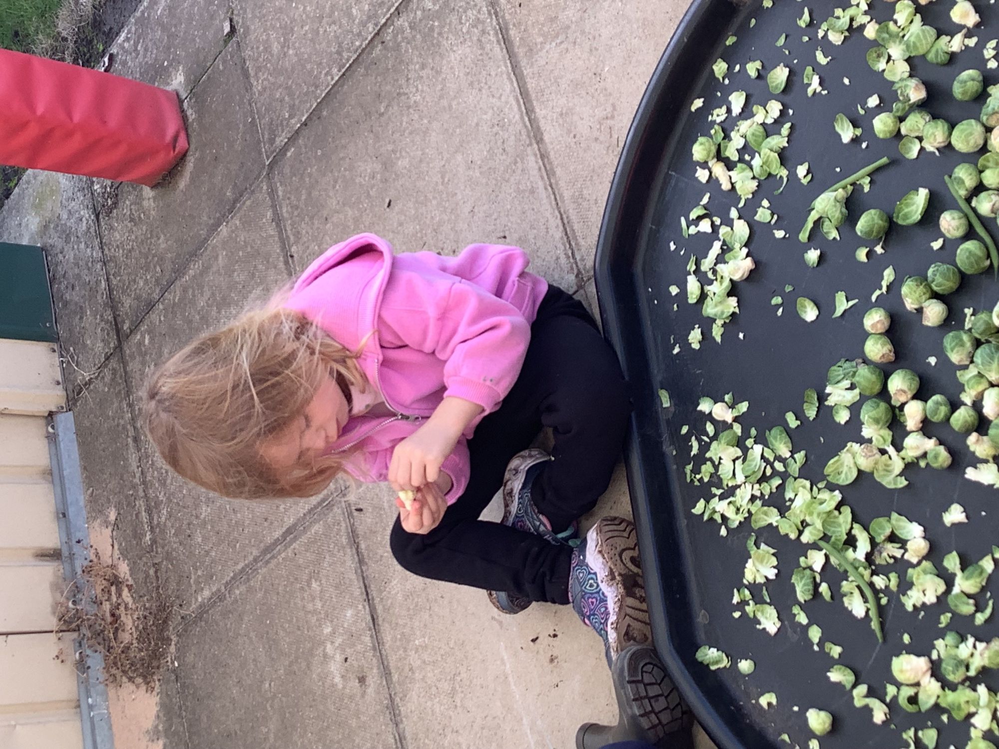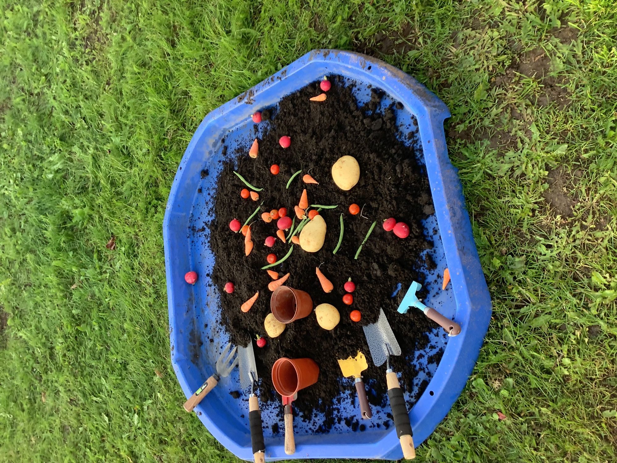 We then went outside to explore lots of activities based around the book. We harvested vegetables, weighed them to sell on our market stall, used our printing skills to create painting using fruit and vegetables, used our fine motor skills to peel sprouts, made a combine harvester out of crates, made potato people, made delicious food in the mud kitchen and enjoyed eating our fruit snacks in the outdoors. We had so much fun while so much learning was happening!