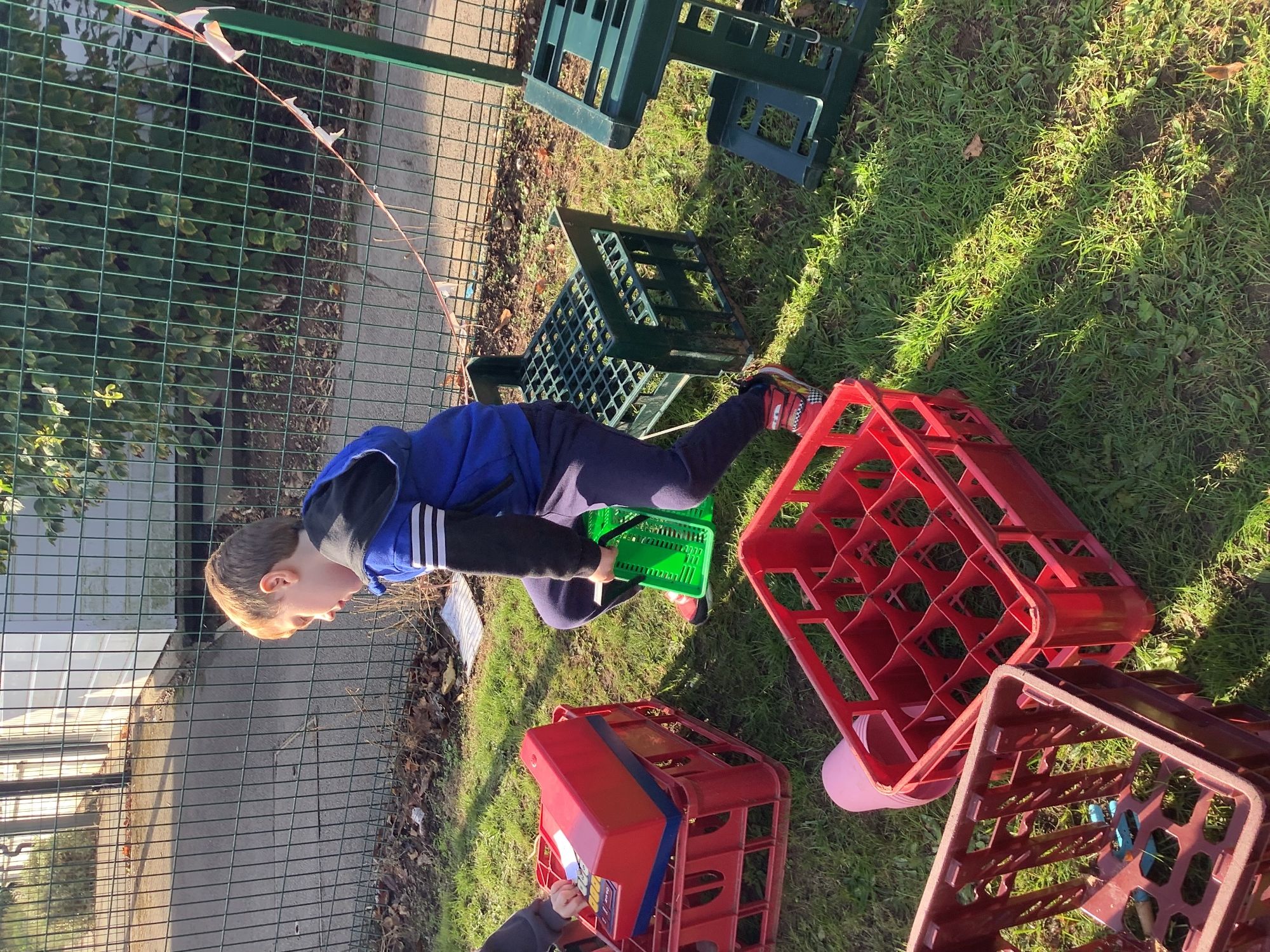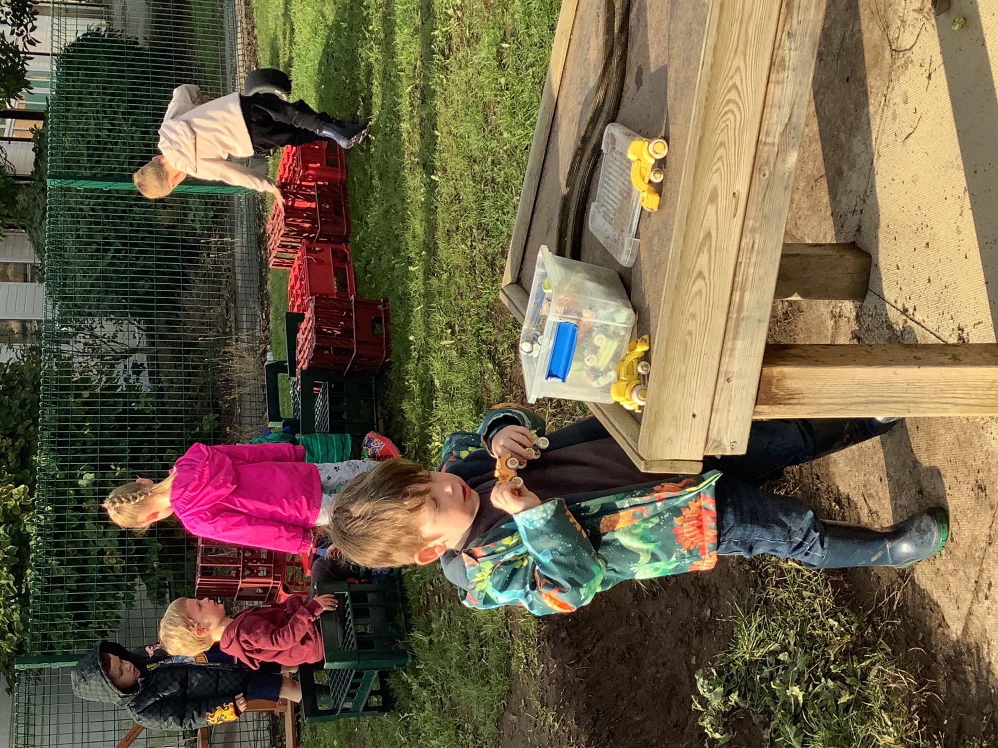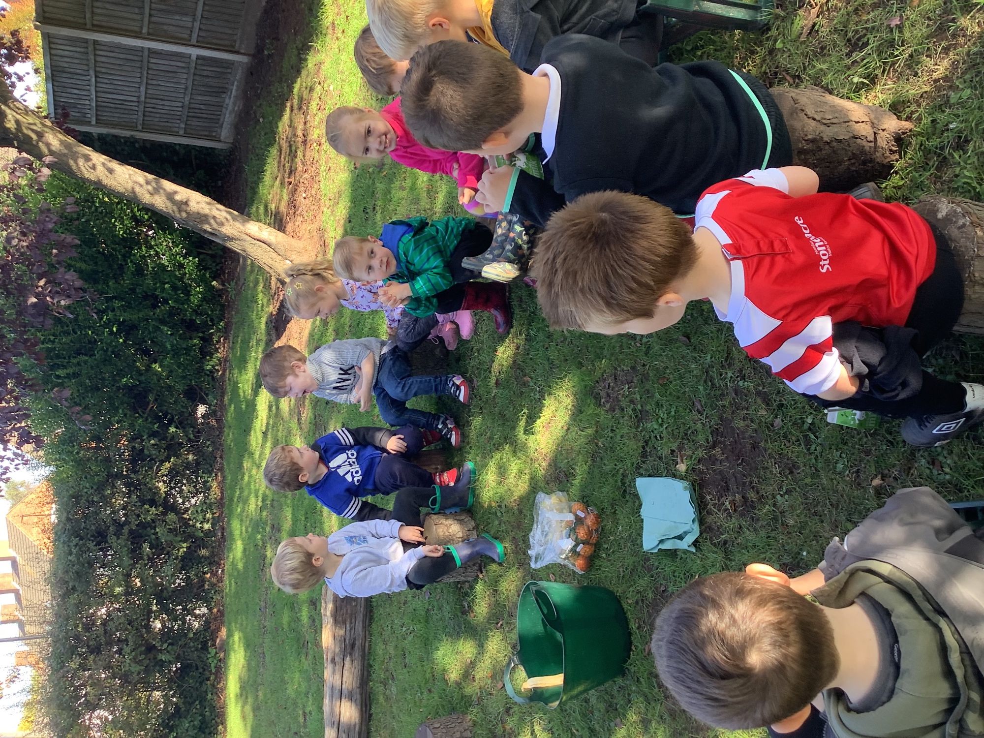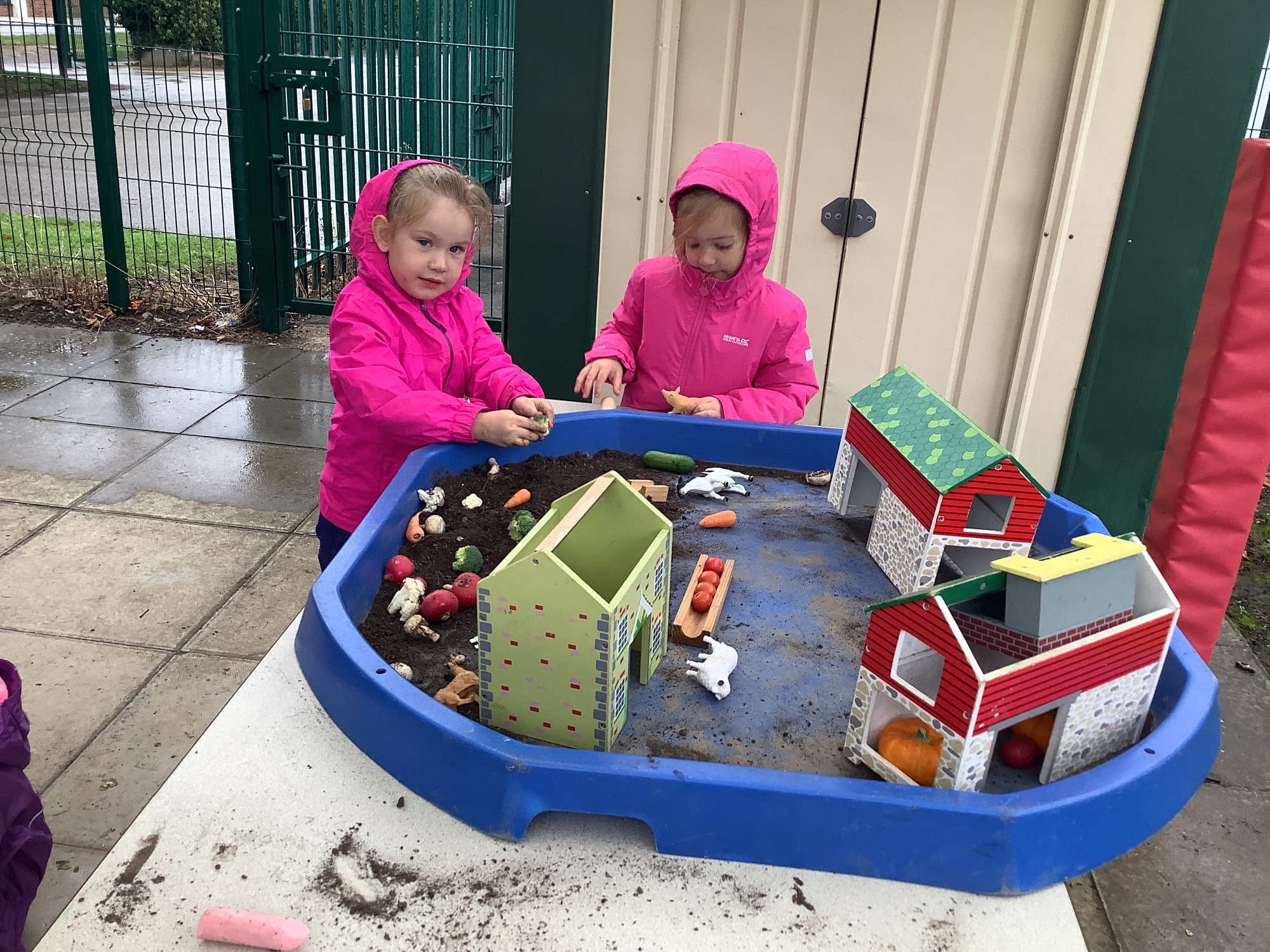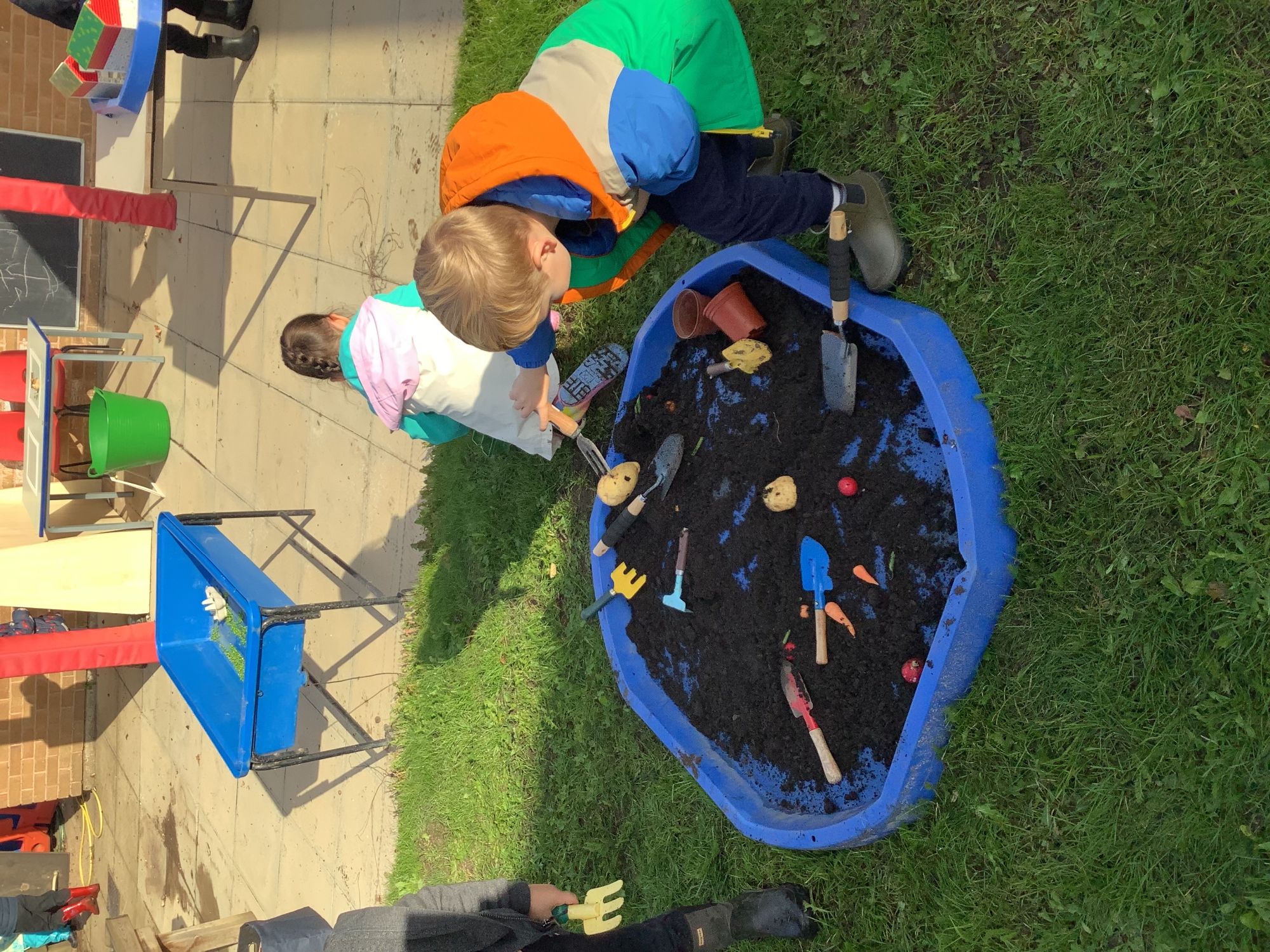 We then went outside to explore lots of activities based around the book. We harvested vegetables, weighed them to sell on our market stall, used our printing skills to create painting using fruit and vegetables, used our fine motor skills to peel sprouts, made a combine harvester out of crates, made potato people, made delicious food in the mud kitchen and enjoyed eating our fruit snacks in the outdoors. We had so much fun while so much learning was happening!