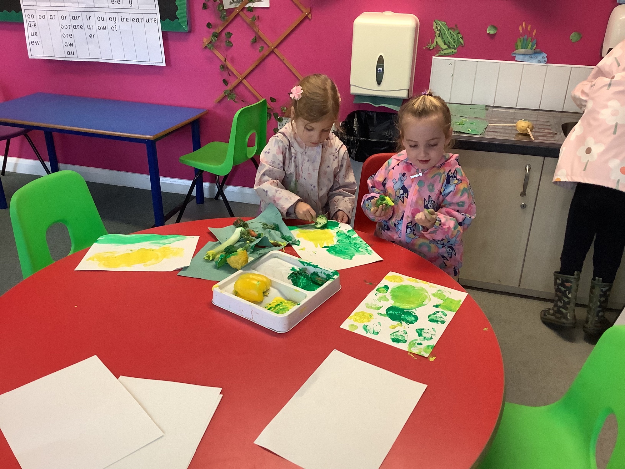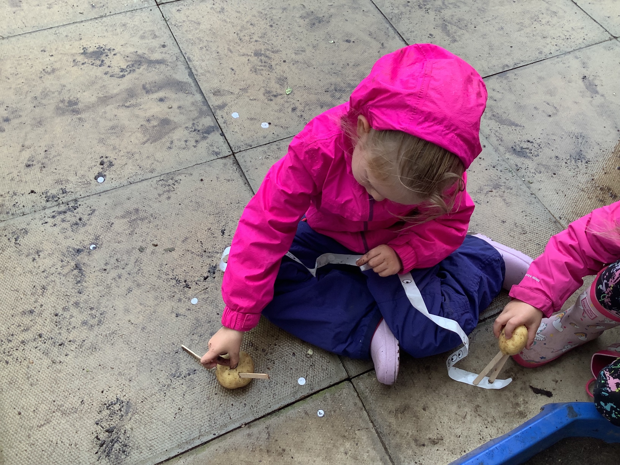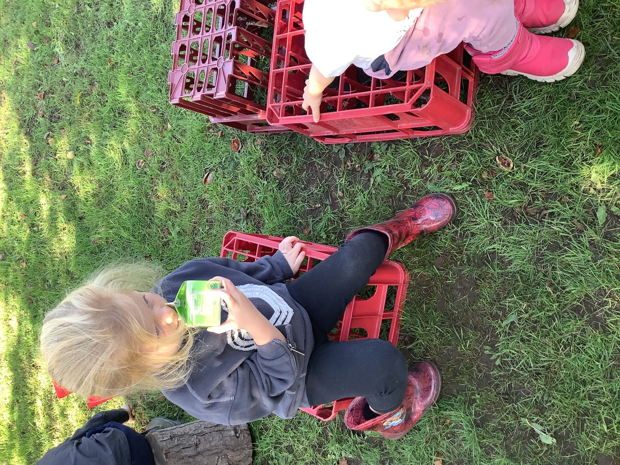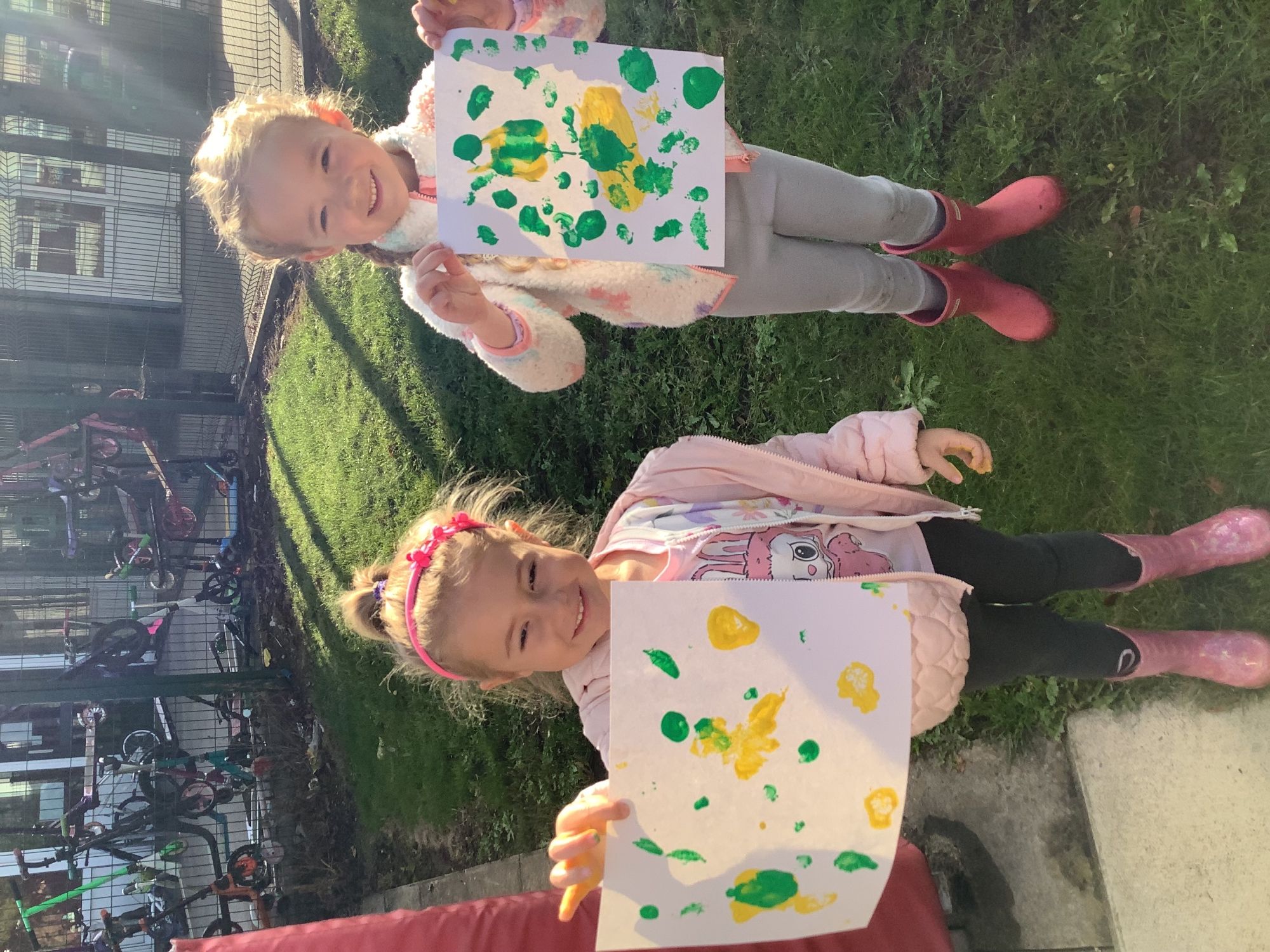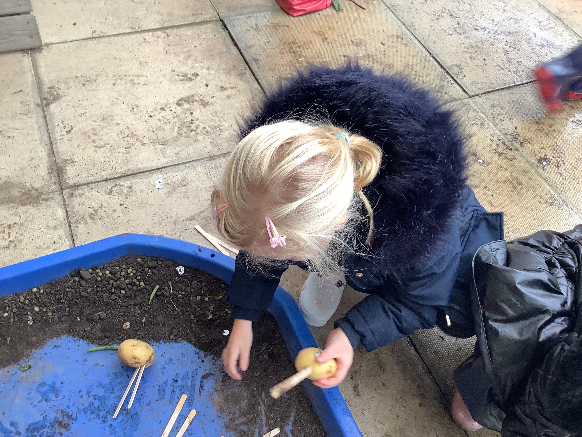 We then went outside to explore lots of activities based around the book. We harvested vegetables, weighed them to sell on our market stall, used our printing skills to create painting using fruit and vegetables, used our fine motor skills to peel sprouts, made a combine harvester out of crates, made potato people, made delicious food in the mud kitchen and enjoyed eating our fruit snacks in the outdoors. We had so much fun while so much learning was happening!
