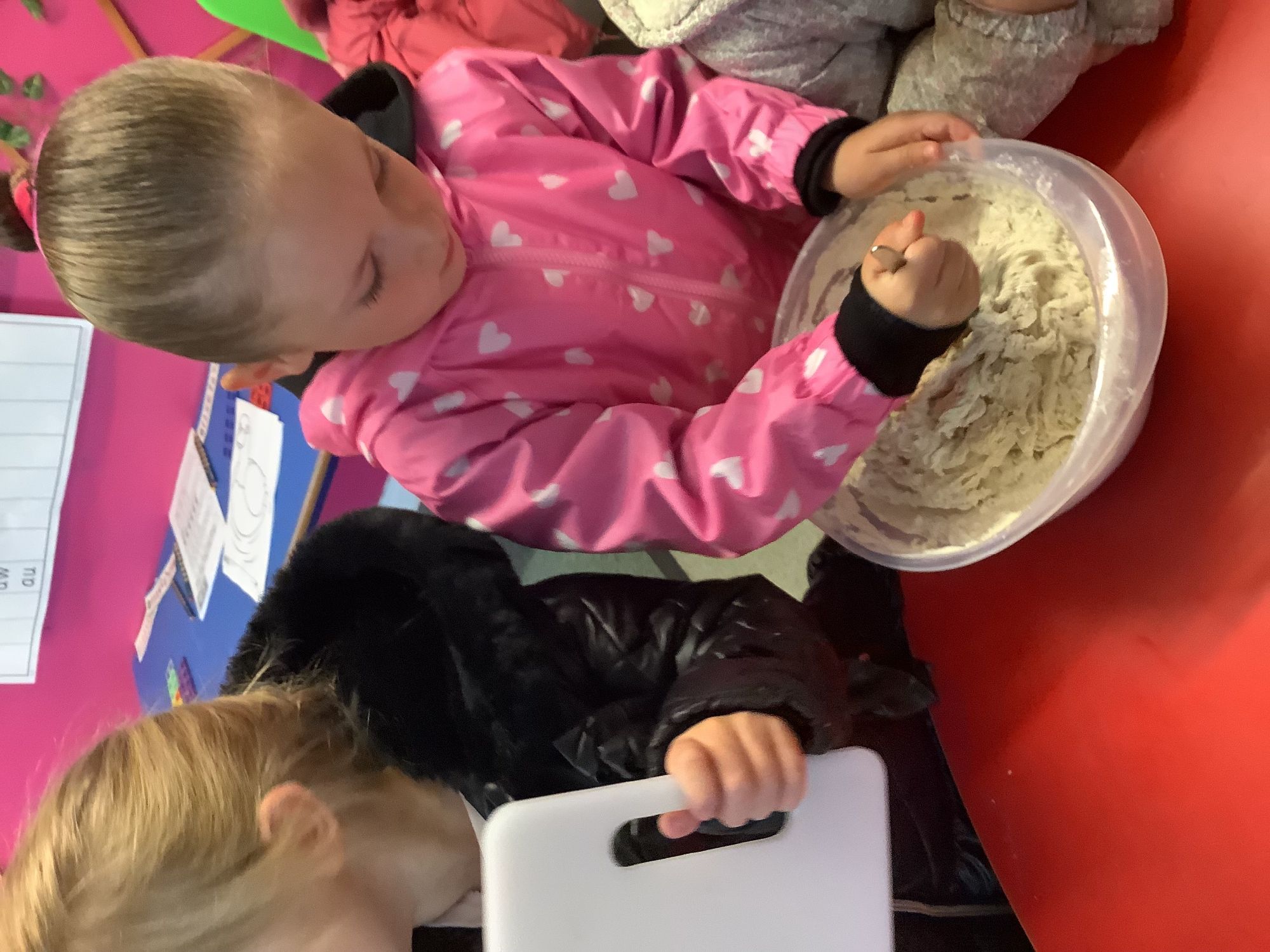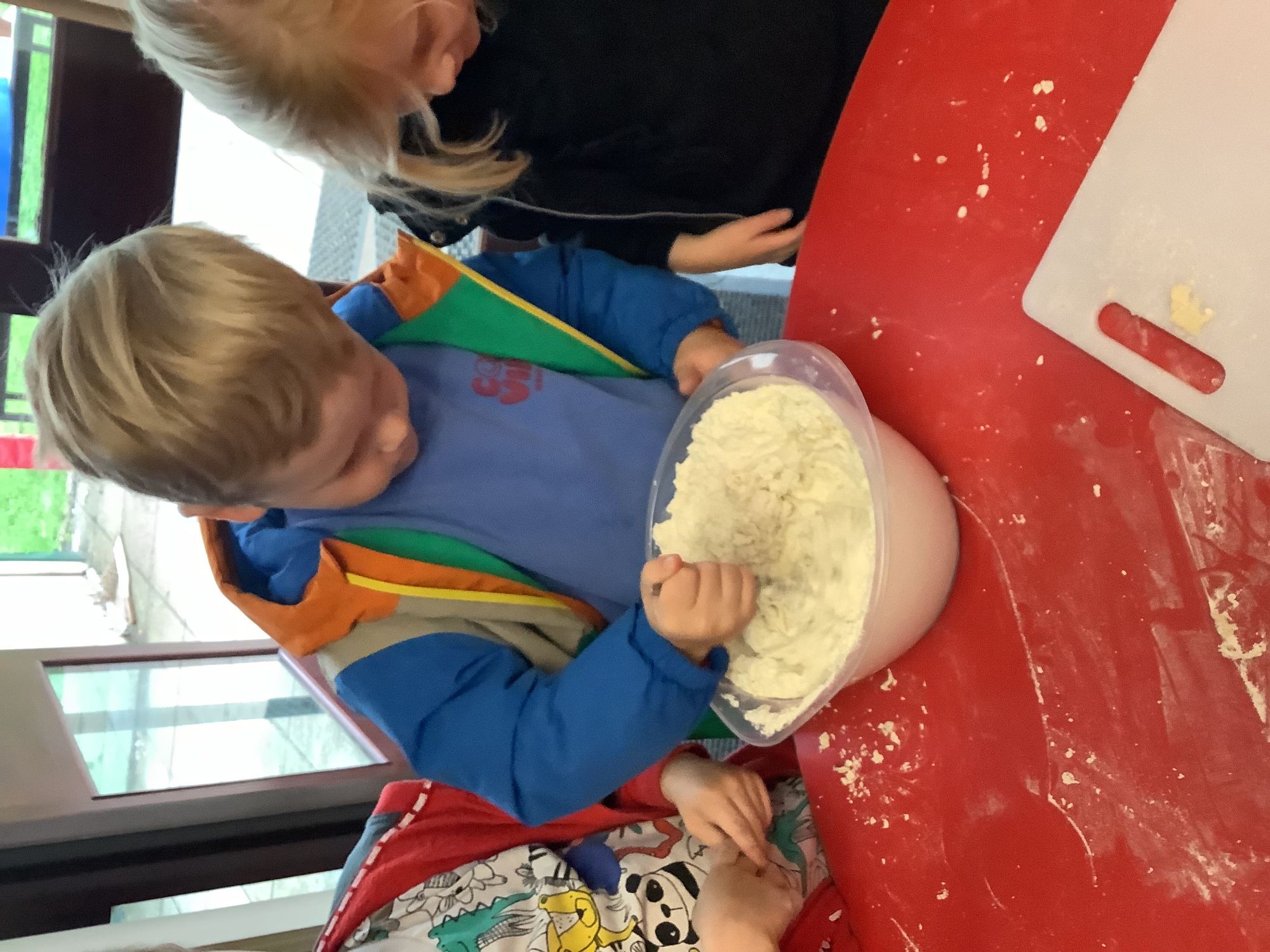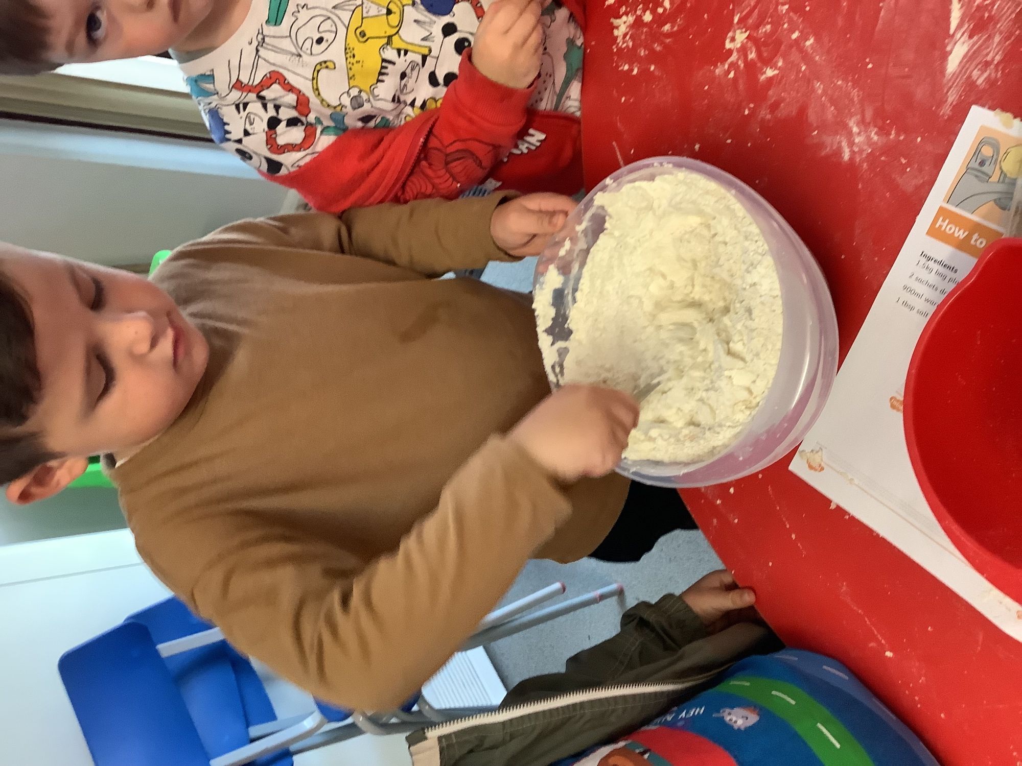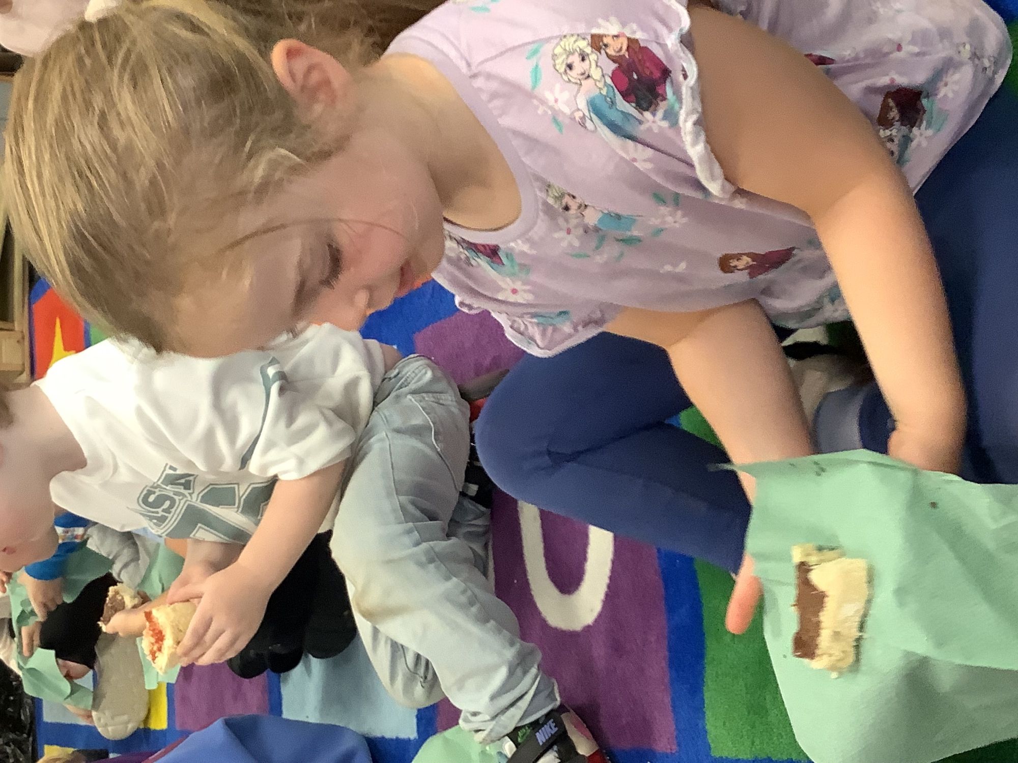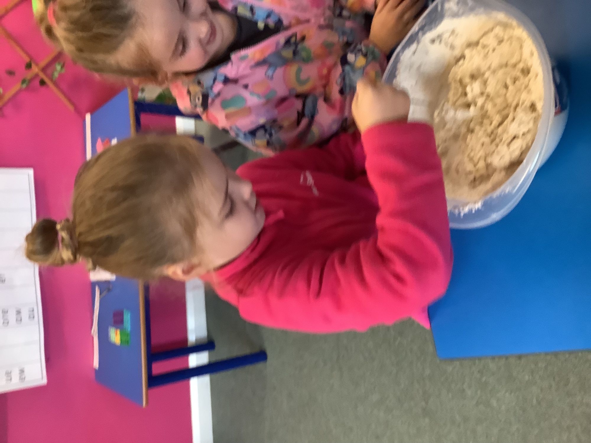 We read the book 'The Little Red Hen' and learnt about the process of harvesting wheat, taking it to the mill to grind into flour and then using the flour to make bread. We had a go at making our own bread, then we had a taste! It was yummy!! We chose our own topping from a choice of butter, jam or chocolate spread, and it's safe to say the chocolate spread was a firm favourite.