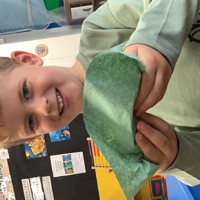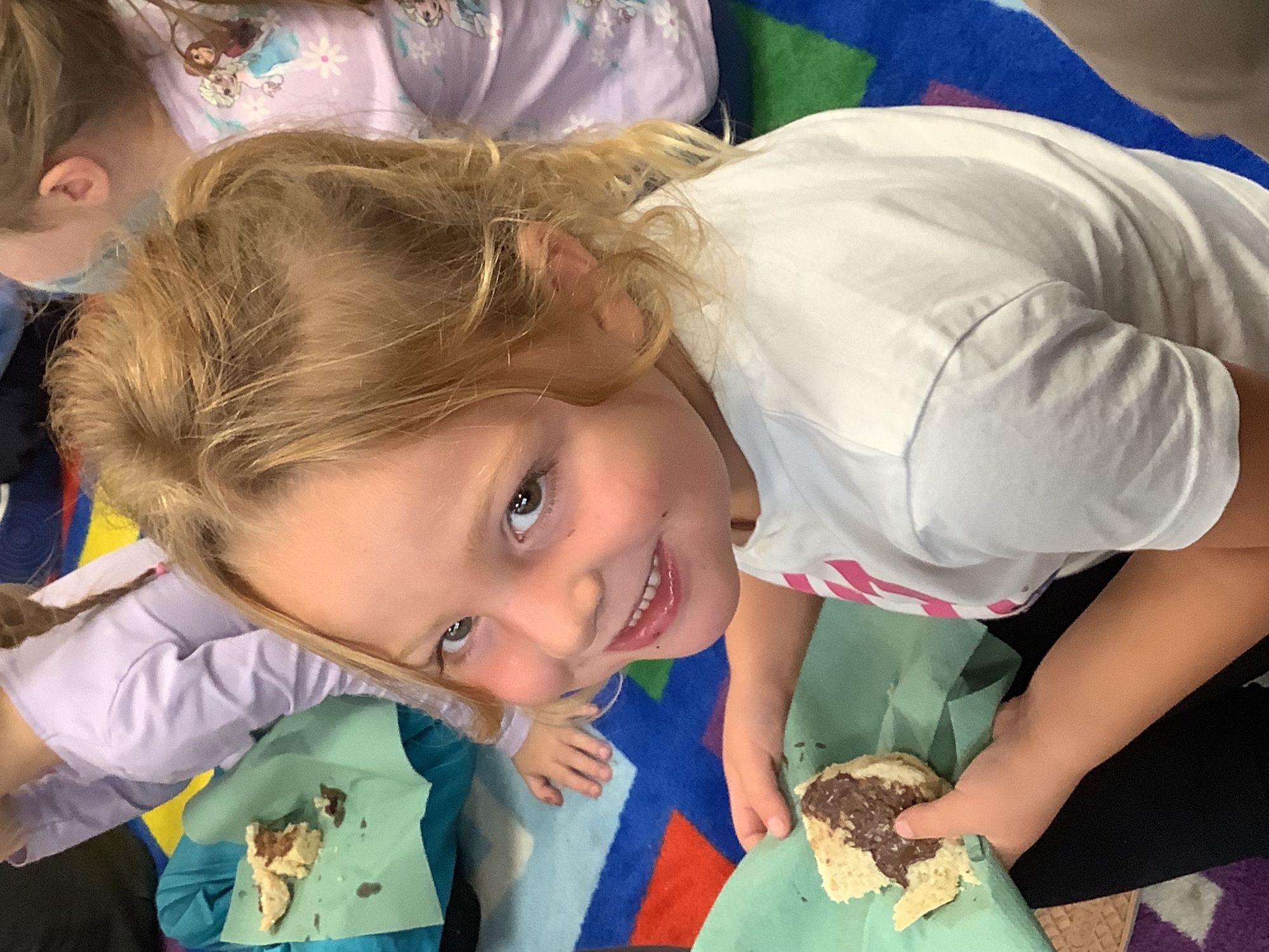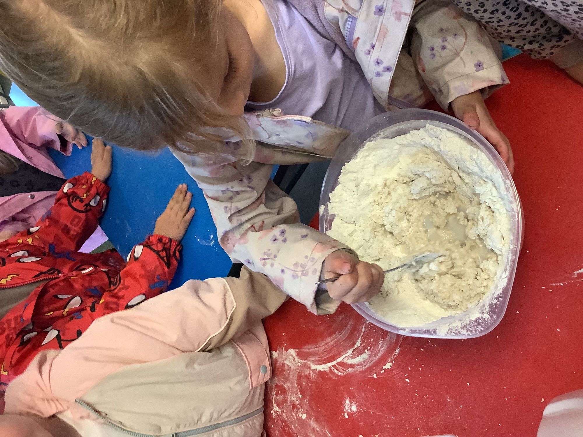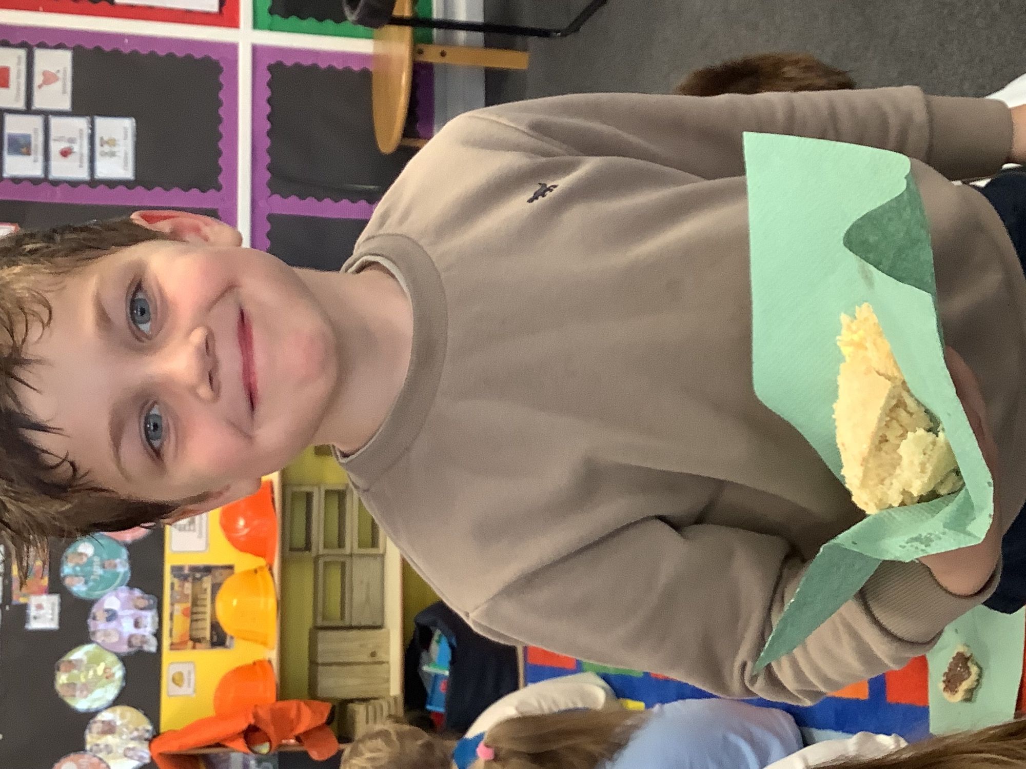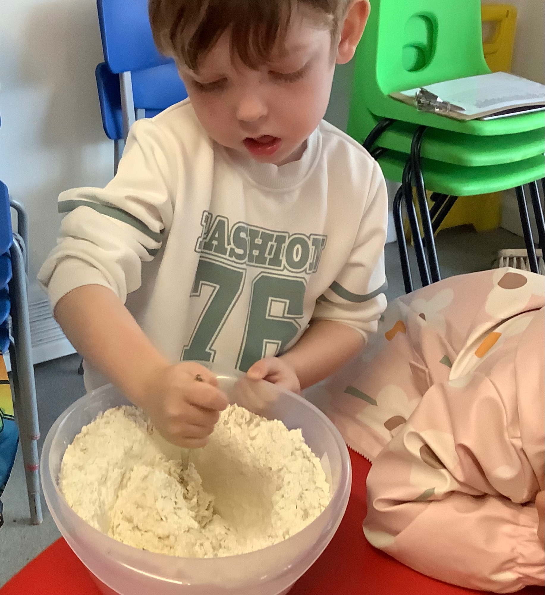 We read the book 'The Little Red Hen' and learnt about the process of harvesting wheat, taking it to the mill to grind into flour and then using the flour to make bread. We had a go at making our own bread, then we had a taste! It was yummy!! We chose our own topping from a choice of butter, jam or chocolate spread, and it's safe to say the chocolate spread was a firm favourite.