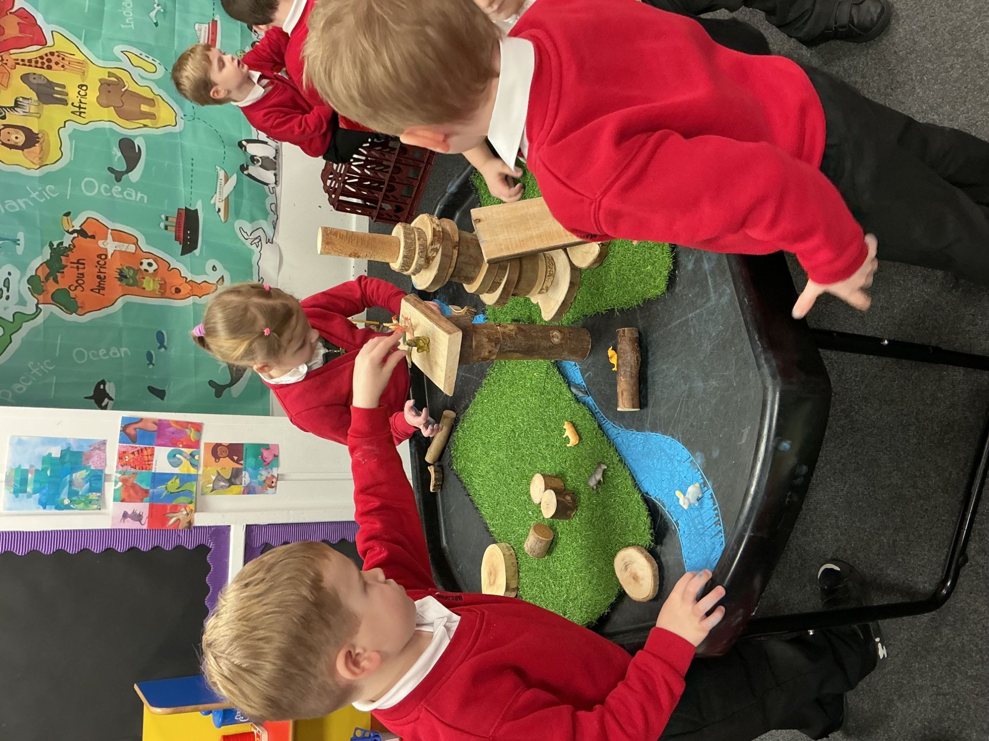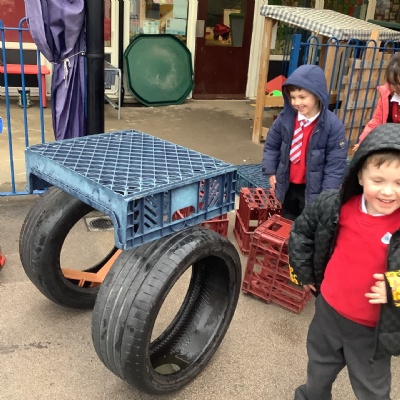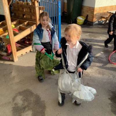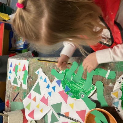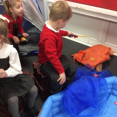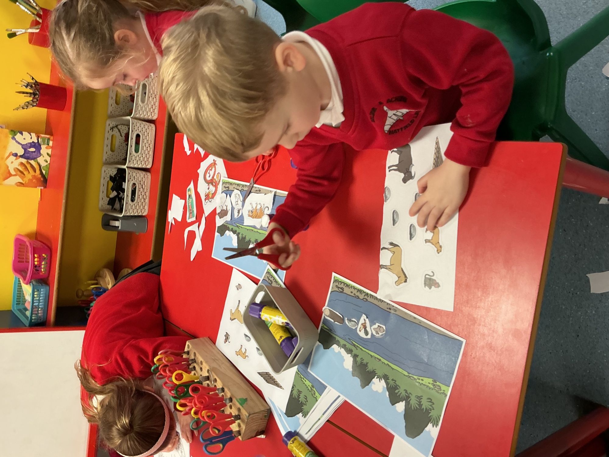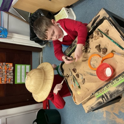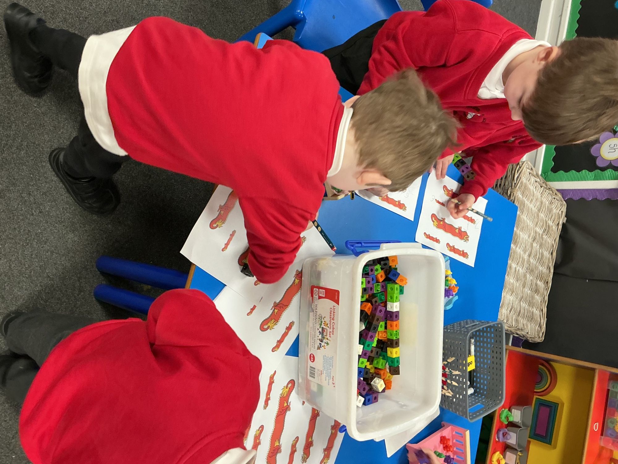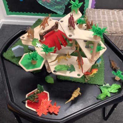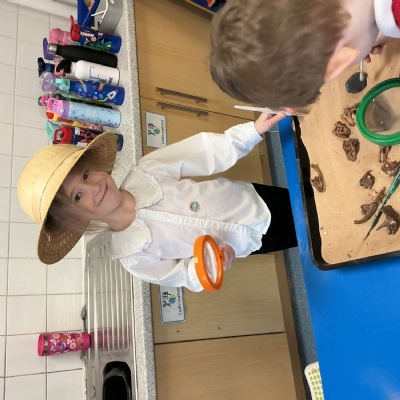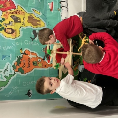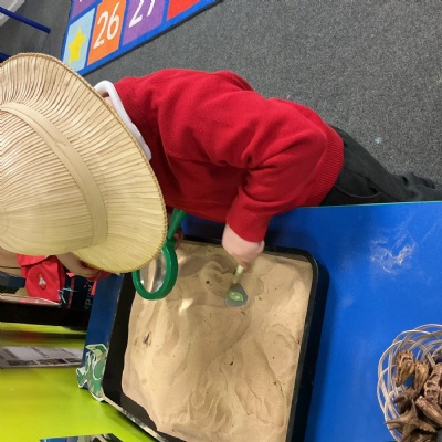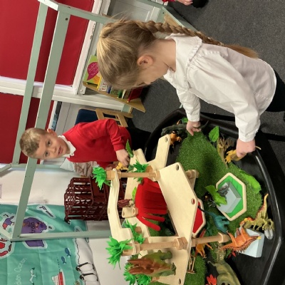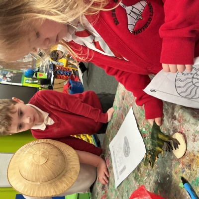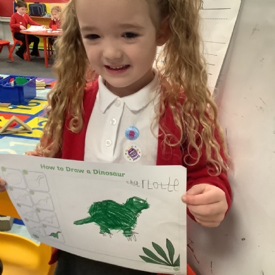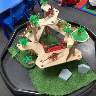 This week has been a 'Drawing Club' week and we have been reading the book 'Dinosaurs Don't Draw.' We have been imagining what we would like to find in the magical cave (Mrs Nottage wanted it to be filled with boxes of chocolates.) We also created a way to scare away the T-Rex and invented interesting objects to draw with. Inside, we have been creating dinosaur worlds and outside, we've been making jeeps to go on a dinosaur safari and magical caves where the dinosaurs live. We've been digging for dinosaur bones and carefully walking on the bridge over the volcano.
