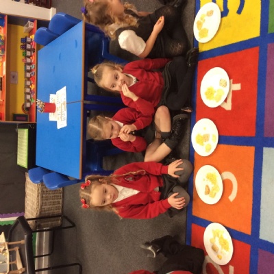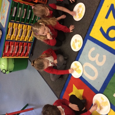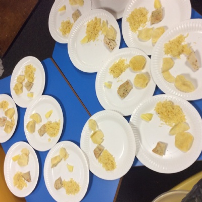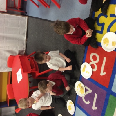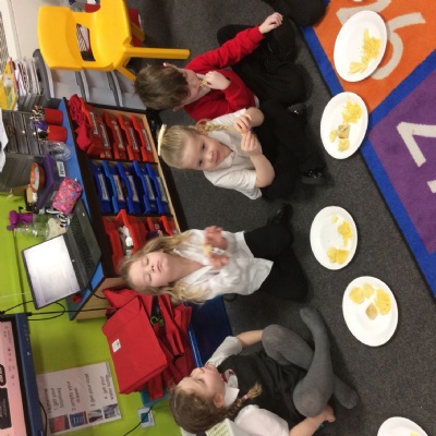 We finished off the week with a food tasting session. We tried a few different Indian foods including rice, popadoms, naan bread and mango. We thought they were really tasty and we wrote a sentence about our favourite.
