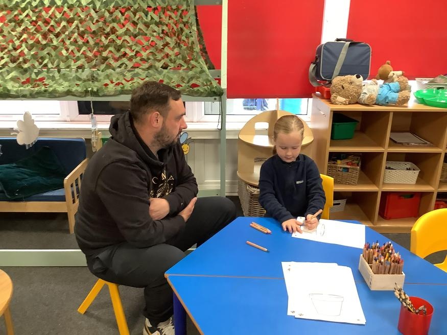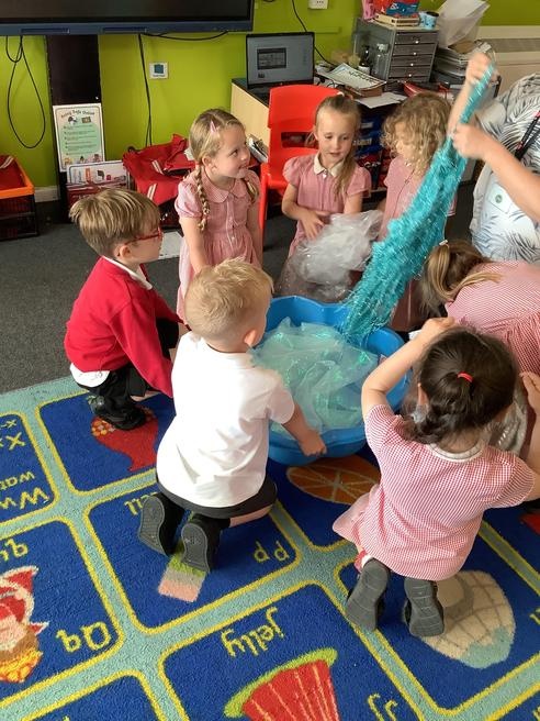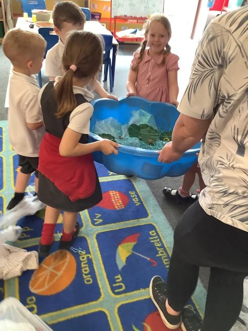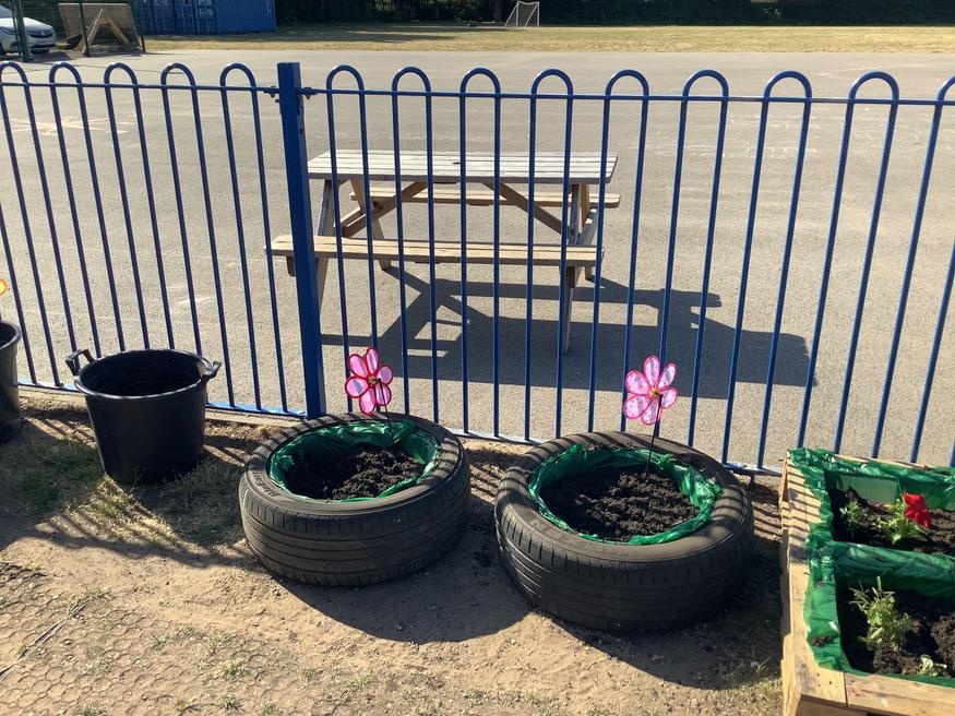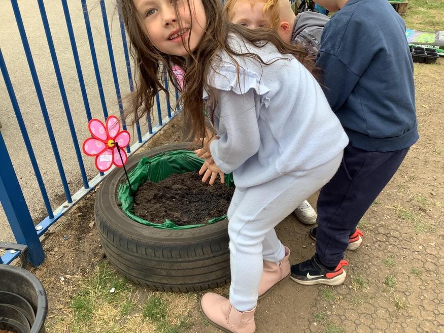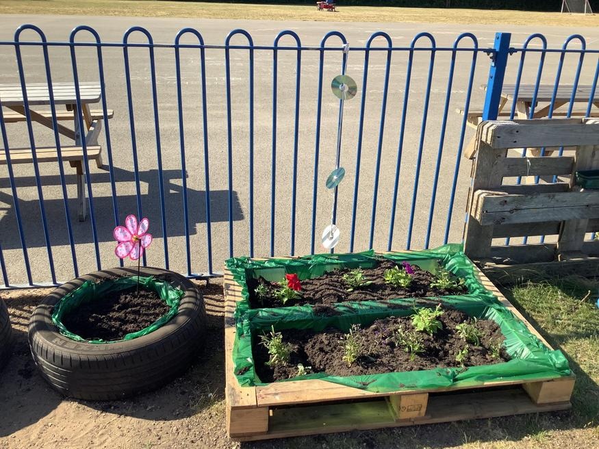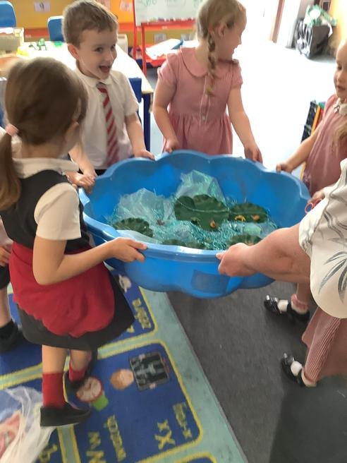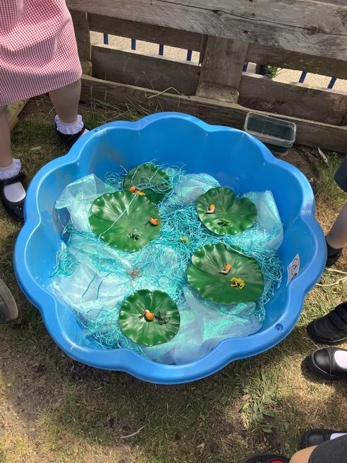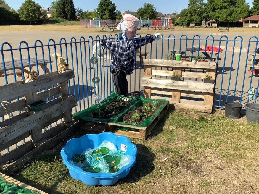 Our challenge week continues, we have now started to prepare for our visitors to come in and help us. We have now all designed our garden and listened to each other’s ideas, we used amazing teamwork to create our scarecrow who is now fixed in our garden. In our designers we decided that we would like to see some wild flowers, sun flowers and bird feeders in our garden. We also discussed having a pond so we used our imagination and made an amazing pond out of shiny materials . We put some lily pads in it as well as as some frogs and snails we think out make believe pond is pretty amazing.