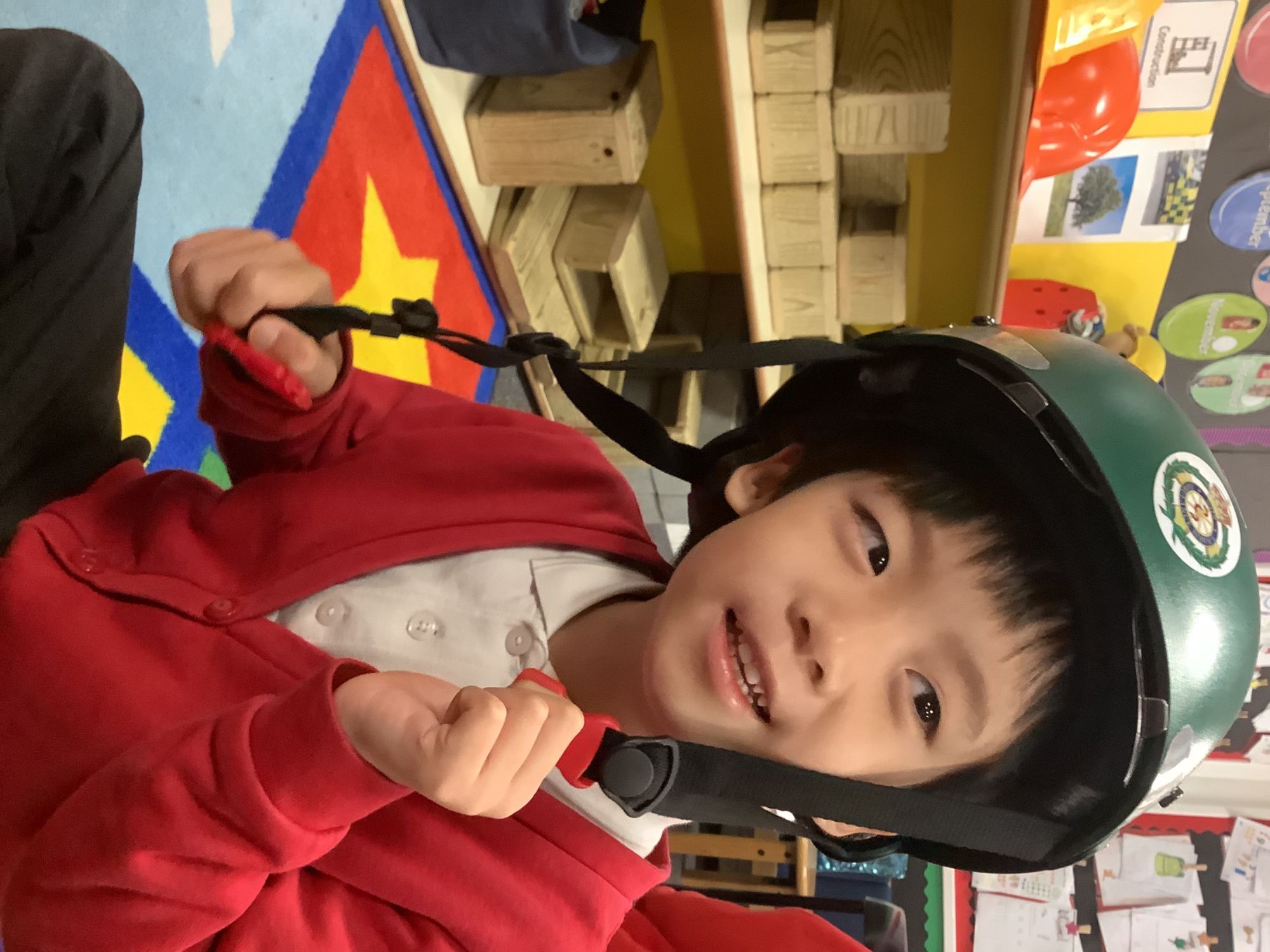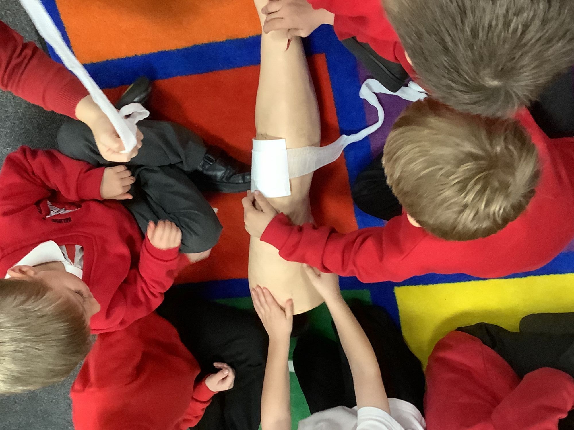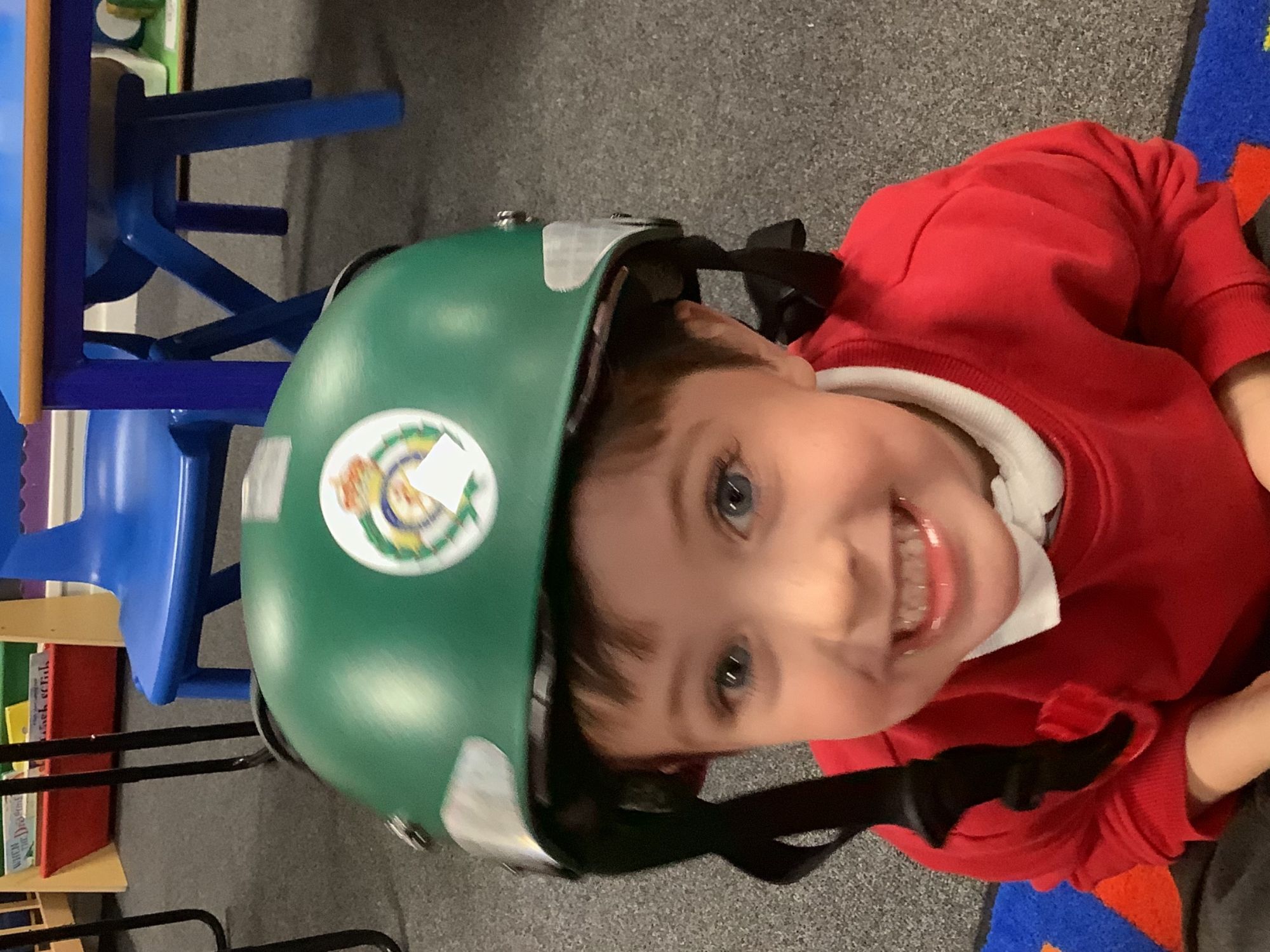 We really enjoyed exploring the things he brought to show us. The helmet was heavier than we thought it would be! And we tried hard to make the bandages stay on the props and ourselves!