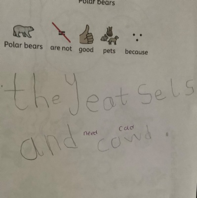 We read the story poles apart, looking for clues on the front cover first to think of what the story might be about, or what characters might be inside! We then thought about both polar bears and penguins and where they lived, and whether we could keep them as a pet or not and why.