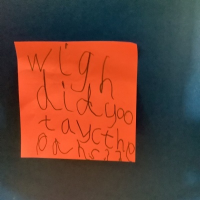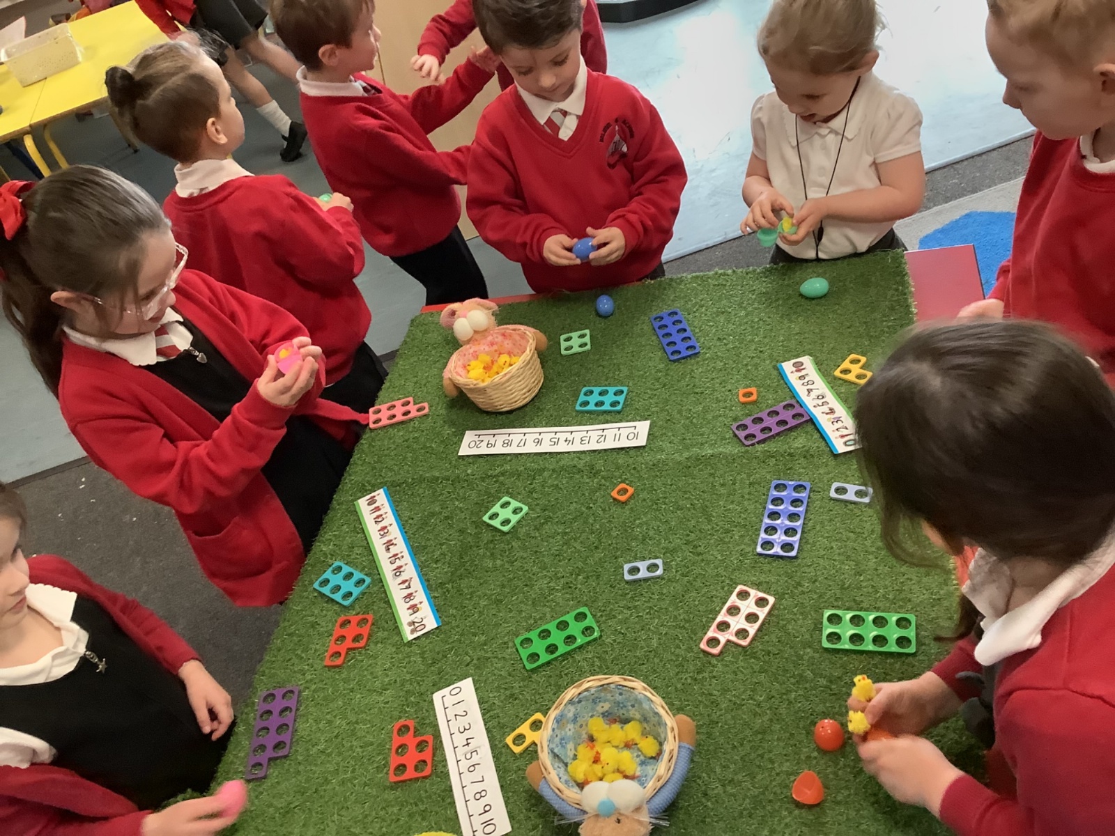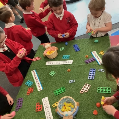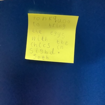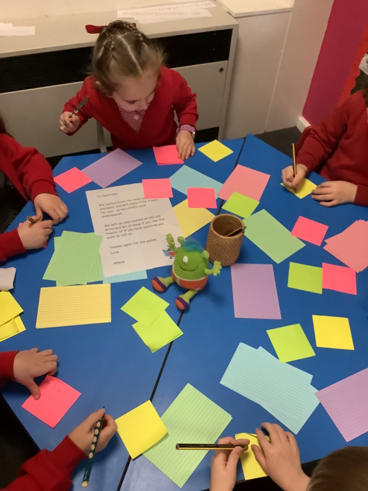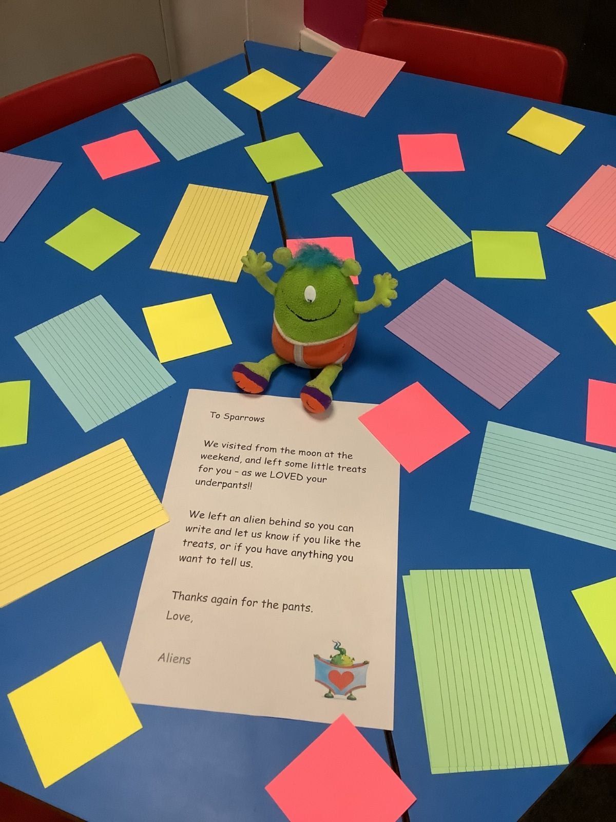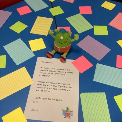 The aliens visited from the moon, and stole all of our spare pants! They did leave us some Easter treats. (Eggs with chicks in) and lots of colourful paper.