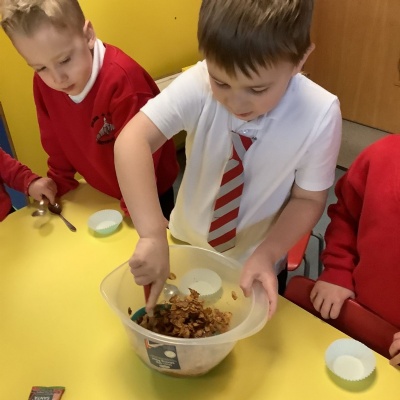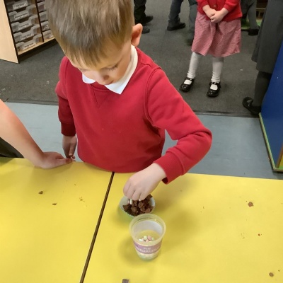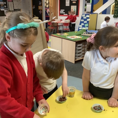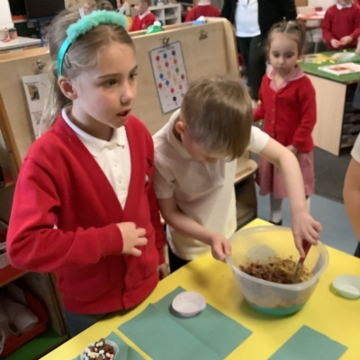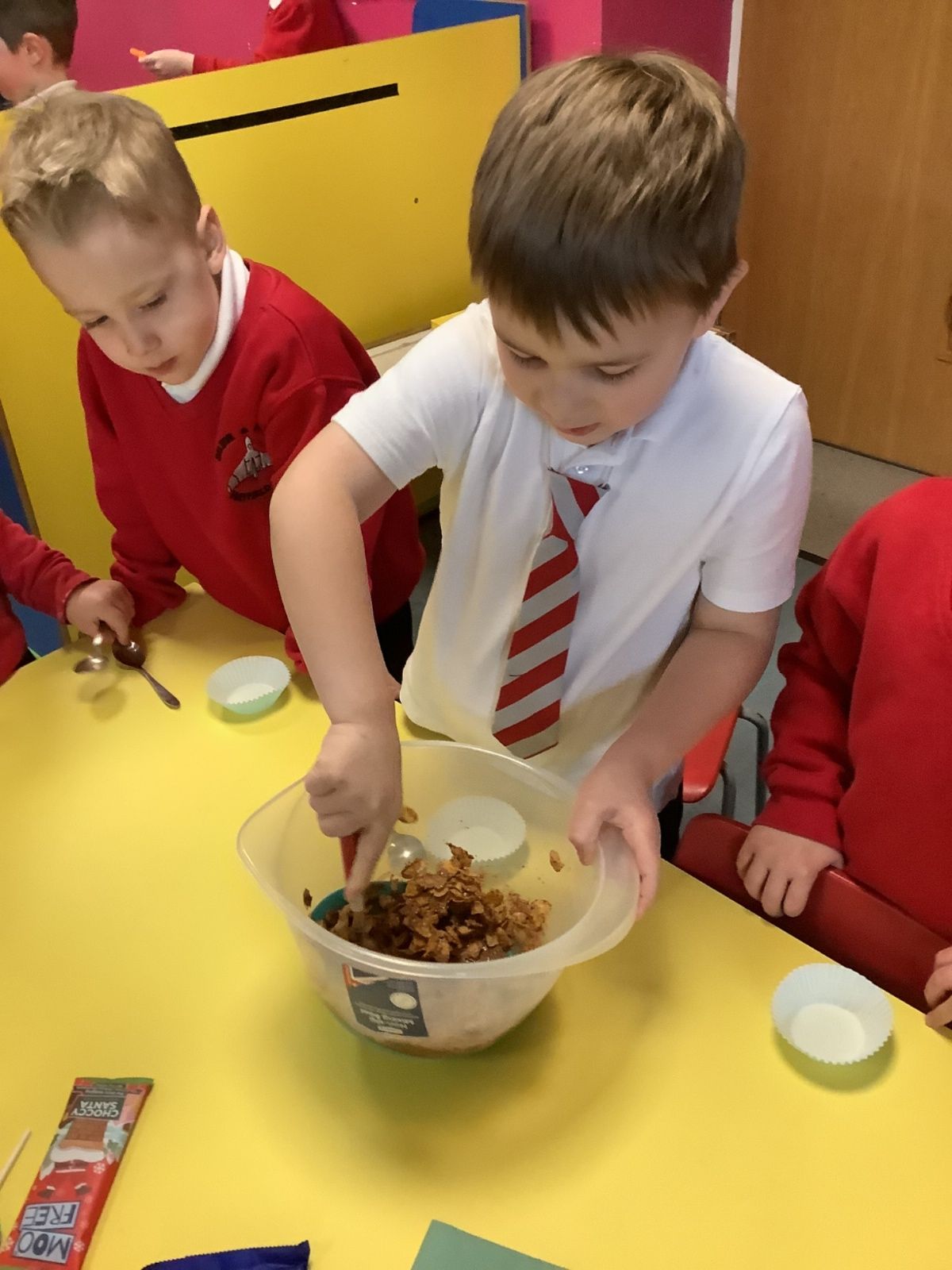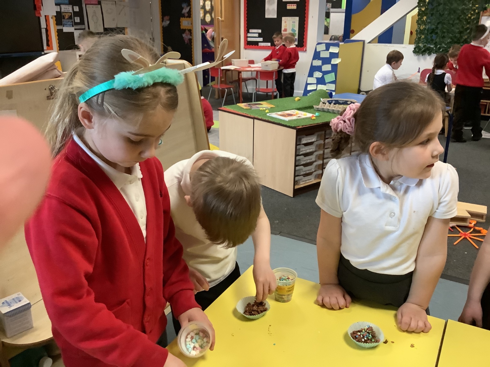 In the afternoon, we made red nose biscuits, mixing icing sugar and food colouring to put on, then adding some jelly tot noses in our favourite colour!
