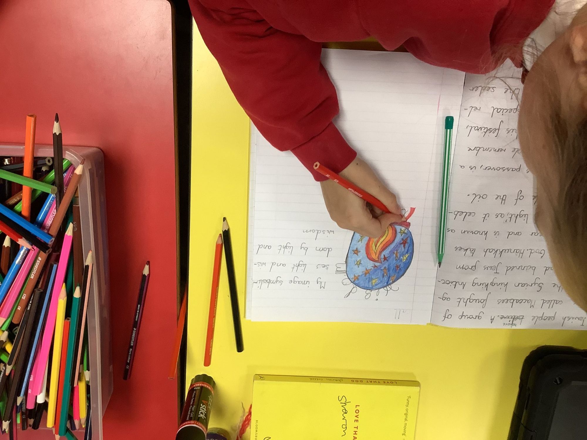 During RE, Y6 began exploring different Jewish festivals. After summarising three of the festivals, they created their own symbol to represent key themes such as peace, wisdom, kindness, respect etc.
