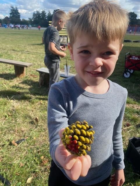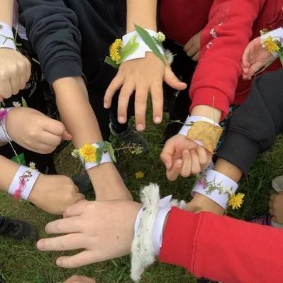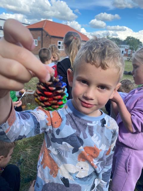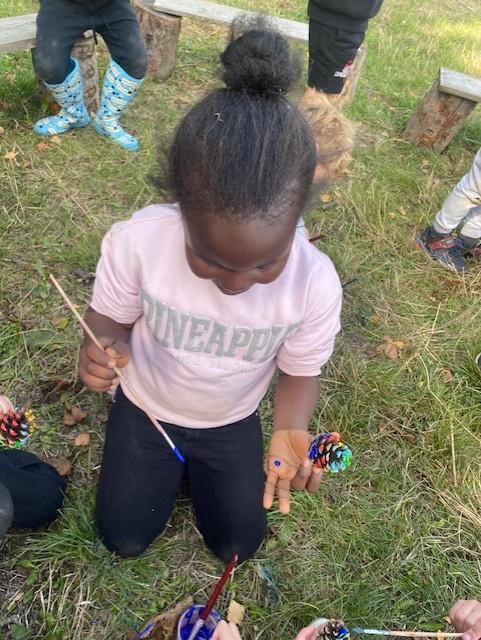 Forest School came back with an autumnal flurry this week when Yr2 Kingfisher Class came to visit. The transitional season of autumn can be seen in our trees, a fresh layer of crispy leaves and crunchy acorns on the ground as well as a beautifully warm sun. We used pine cones to create natural artwork that has been hung on our outdoor classroom (The Hut) for everybody to see. We all enjoyed the fresh air, friends and a 'crafty' afternoon.