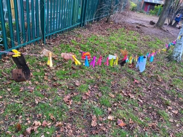 This isn't any old washing line, this is a FOREST SCHOOL washing line! When a child finds something amazing, interesting and wonderful, they want to share it with others. Here at forest school, we encourage a child to share their findings with a friend, this washing line is the next level! As the children were busy in Forest School and they found something amazing that they wanted to show, they hung it on the line. It stayed there for the whole session, for all to see and they had the opportunity to share it with the group at the end of the afternoon if they wished. We had a piece of bark, a leaf, a crisp packet and much more. A child finds wonder everywhere.