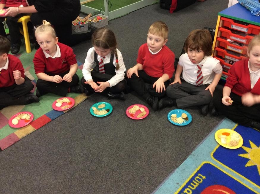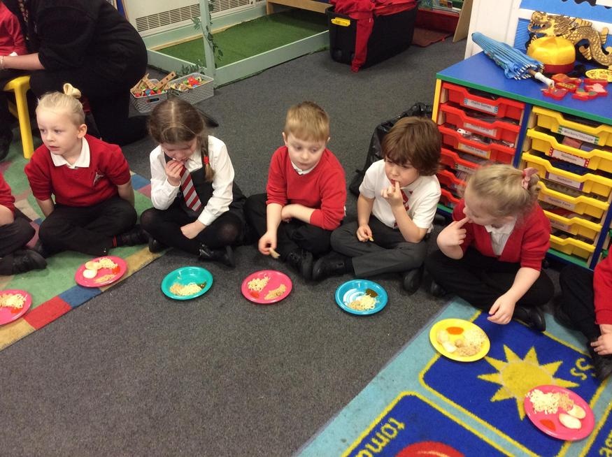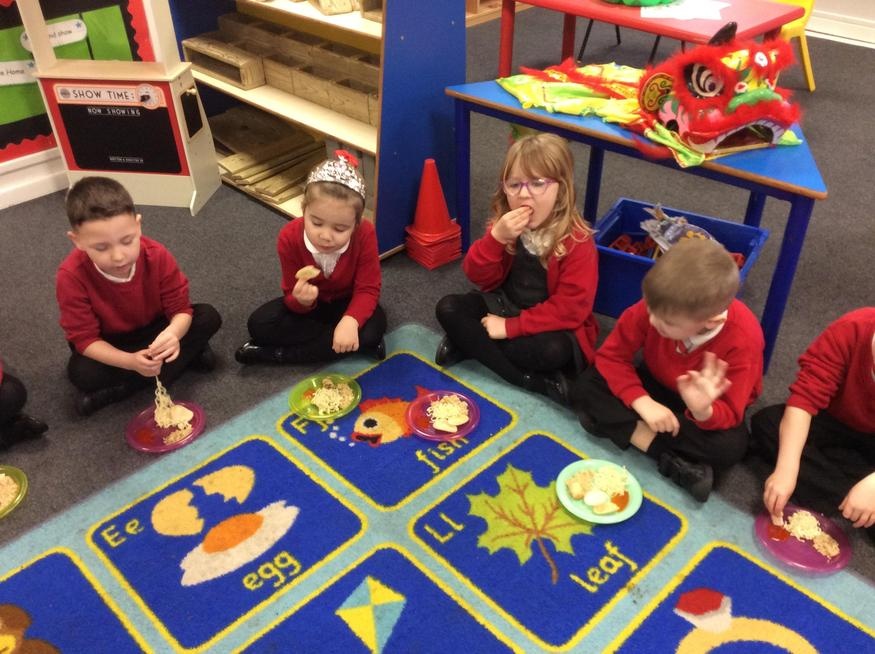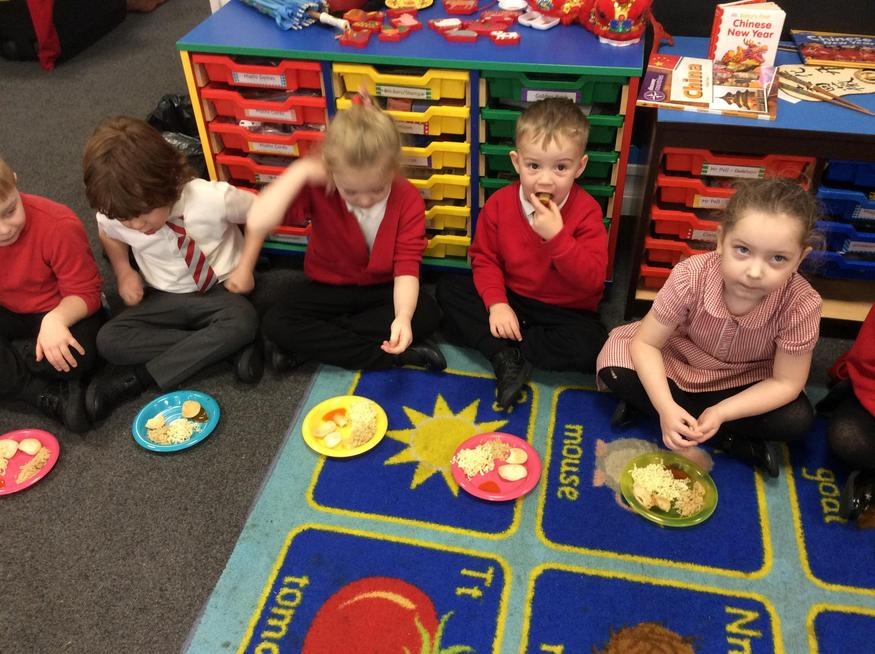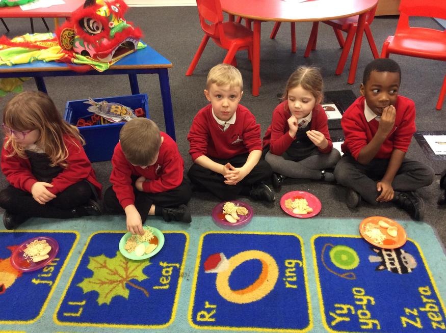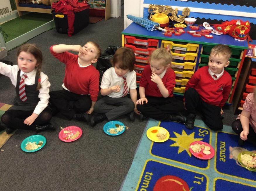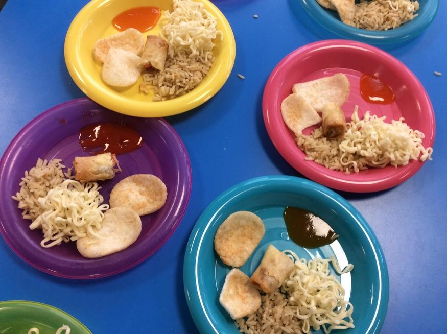 We also tasted some Chinese food. We tried some noodles, fried rice, prawn crackers, spring rolls and some sweet and sour sauce. We thought the crackers were crunchy and we really liked the spring rolls. We all though it was yummy.