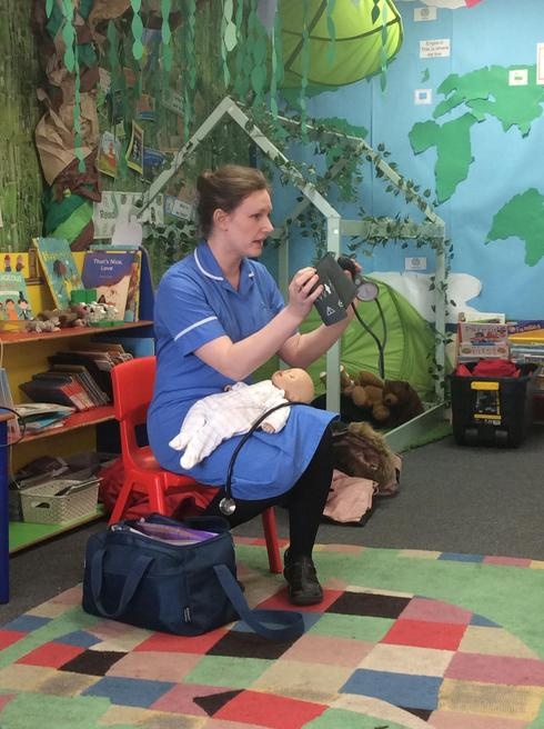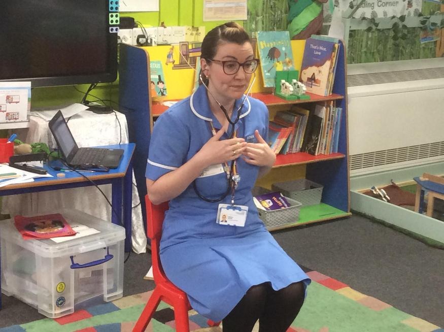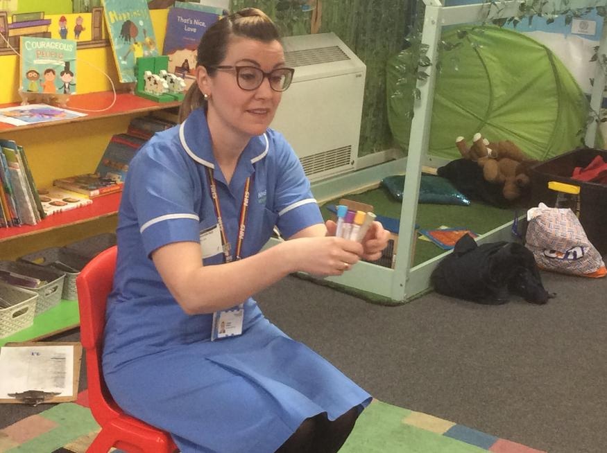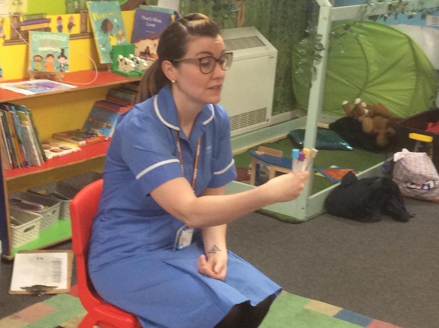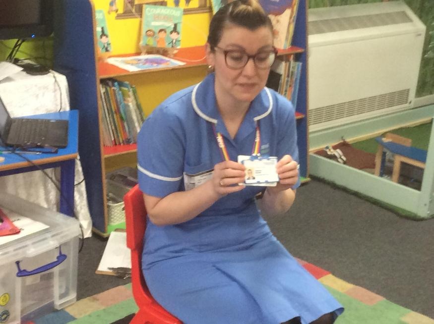 Our second visitor was a community nurse, she told us all about working in the community and helping people get better and she showed us some equipment that she takes around with her. Again we asked questions such as “ How do you make people better?” “Do you phone ambulances.” “ Do you give medicine to make people better?”