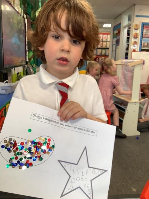 We designed some magic beans then wrote a wish . We wished for lots of different things.
