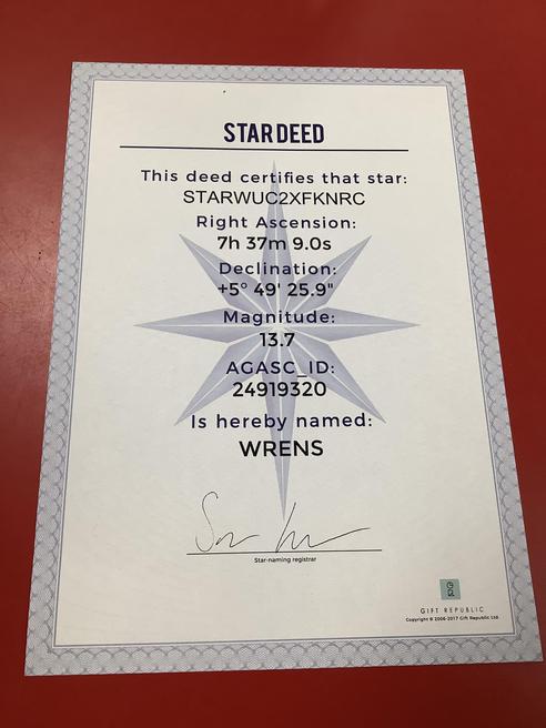 We are very excited because we had a name a star donated to us by Mrs Headley, so we now have a special star in the sky named Wrens.