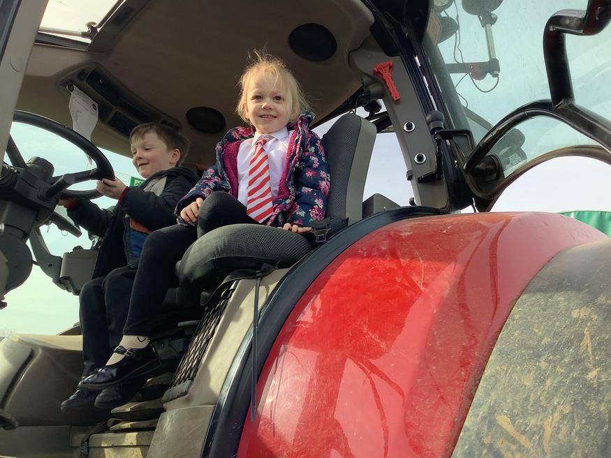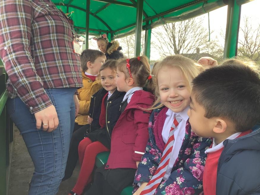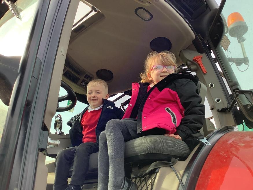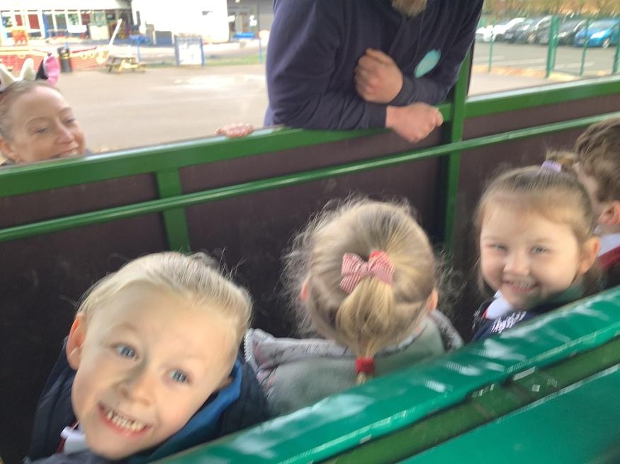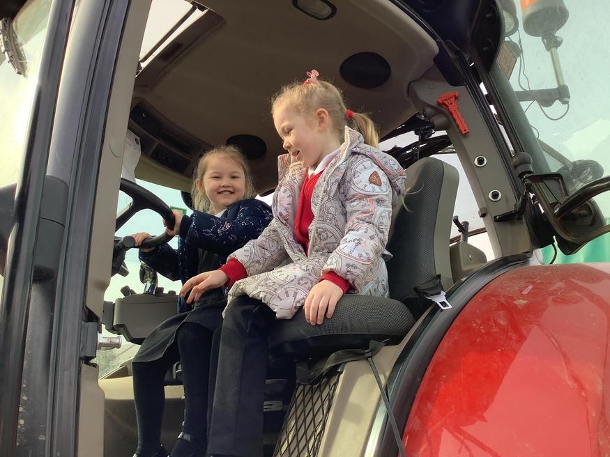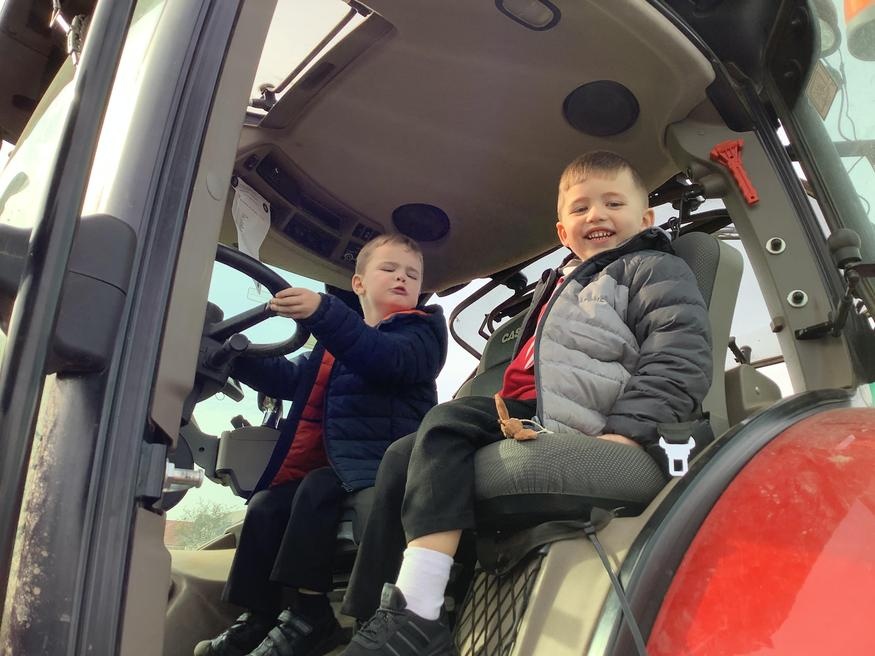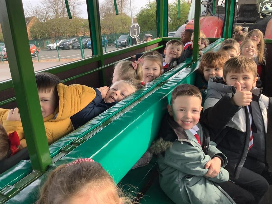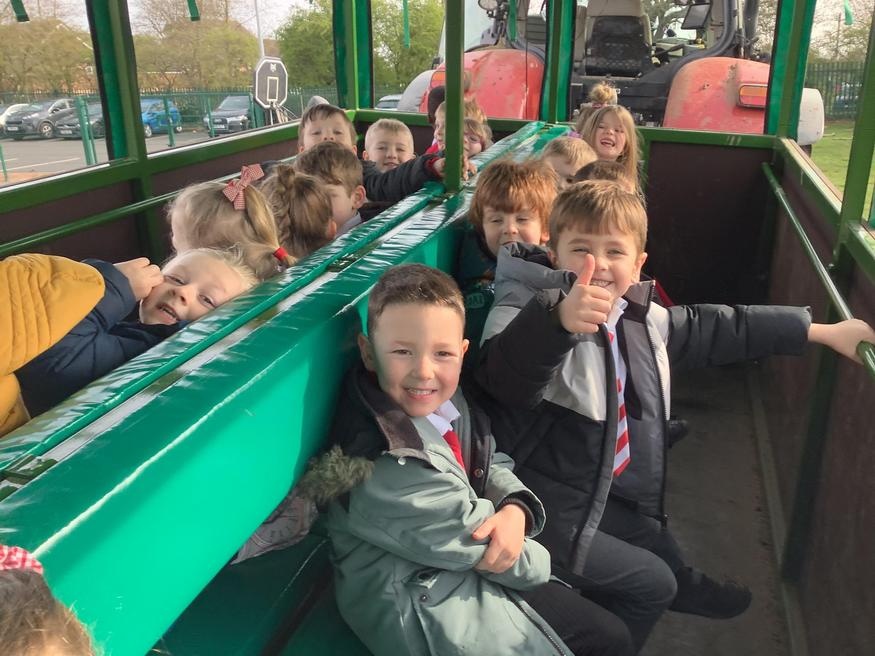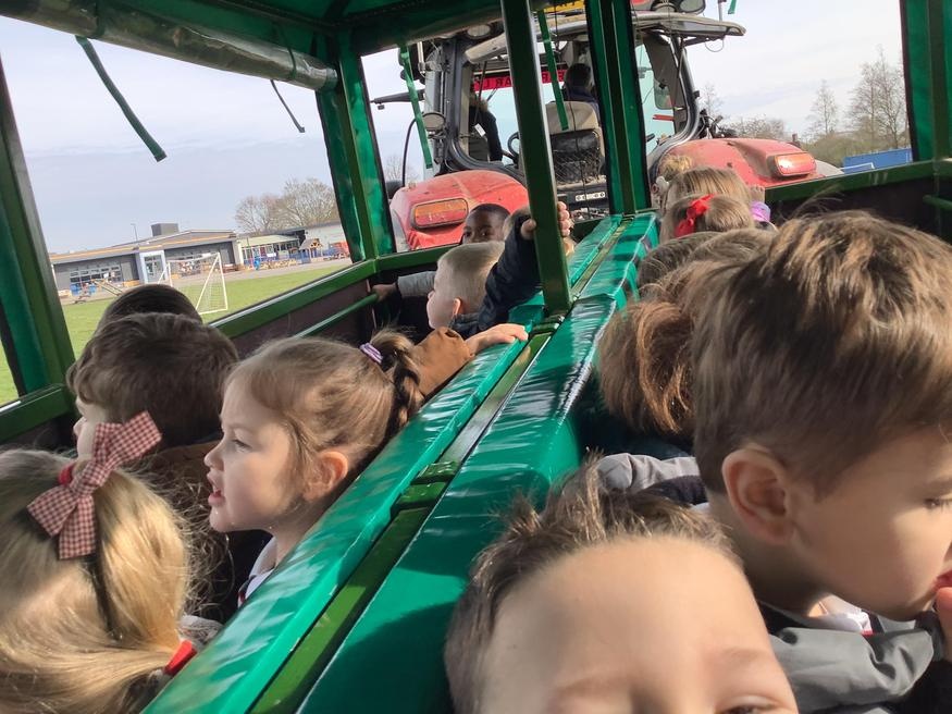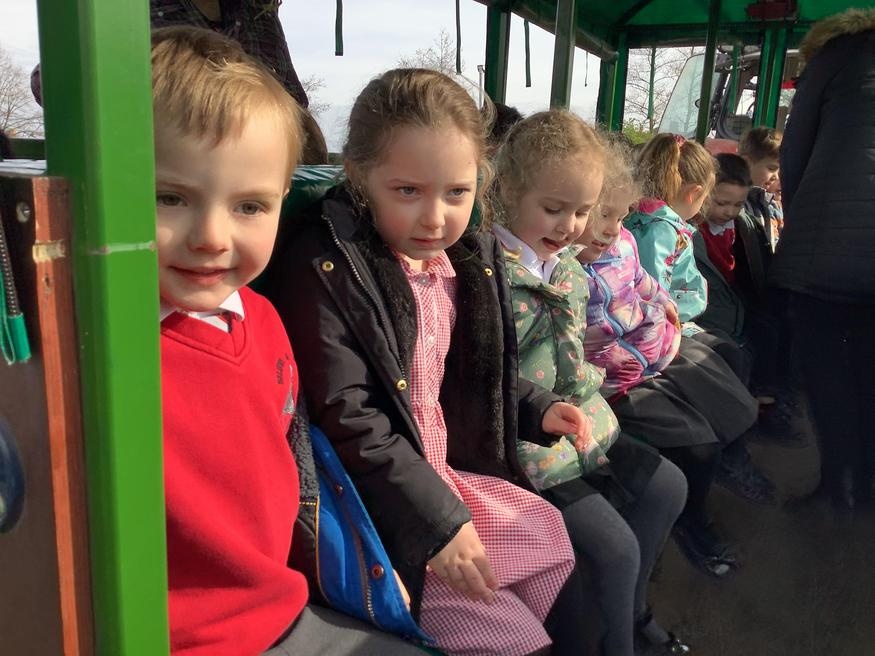 We also had a ride in the tractor trailer ,we went round the field and up the hill. We sang Old McDonald as we went round. We then got to sit in the front of the tractor it was very high up. We enjoyed going on the tractor.