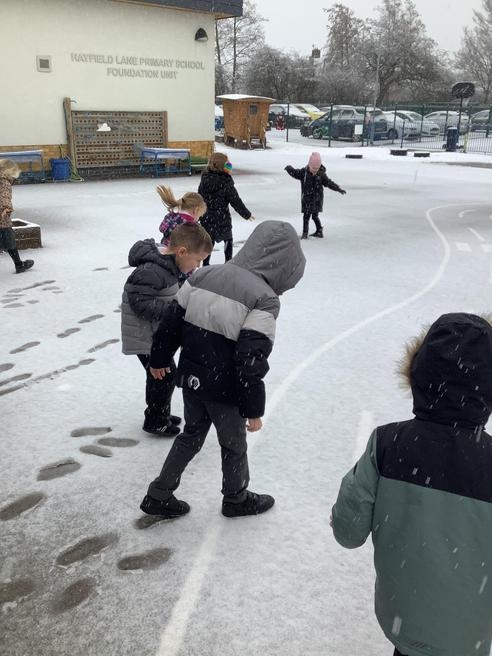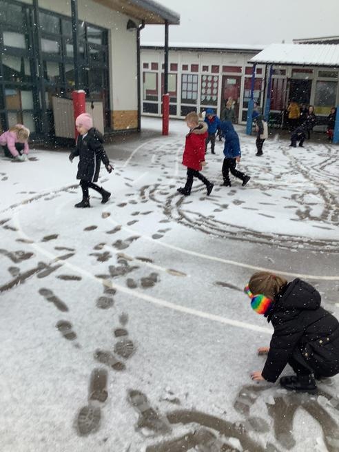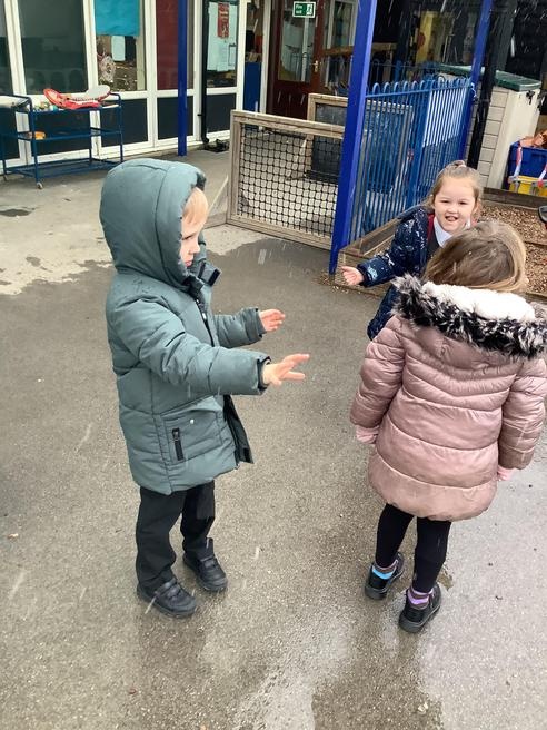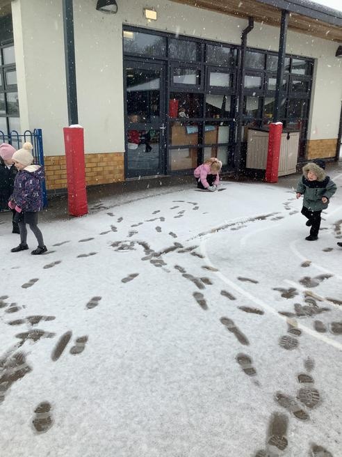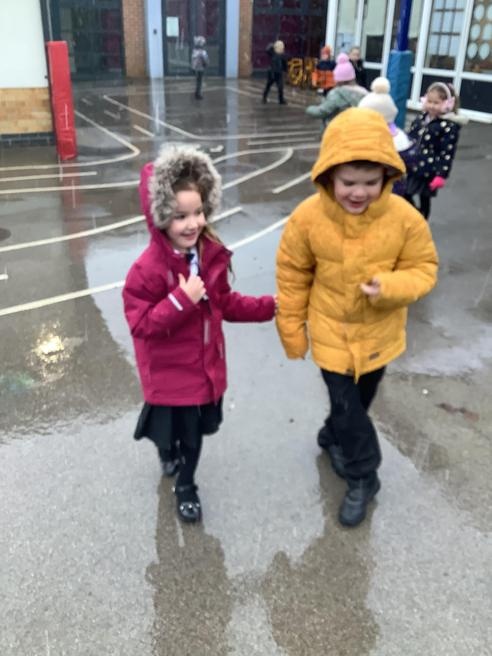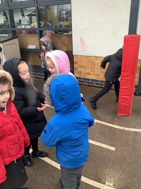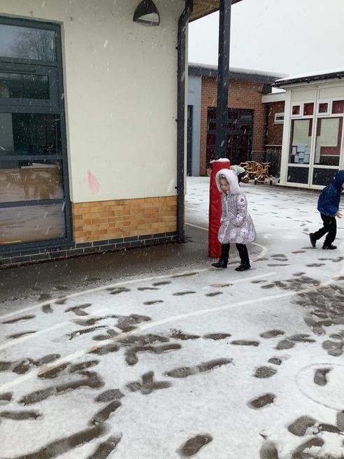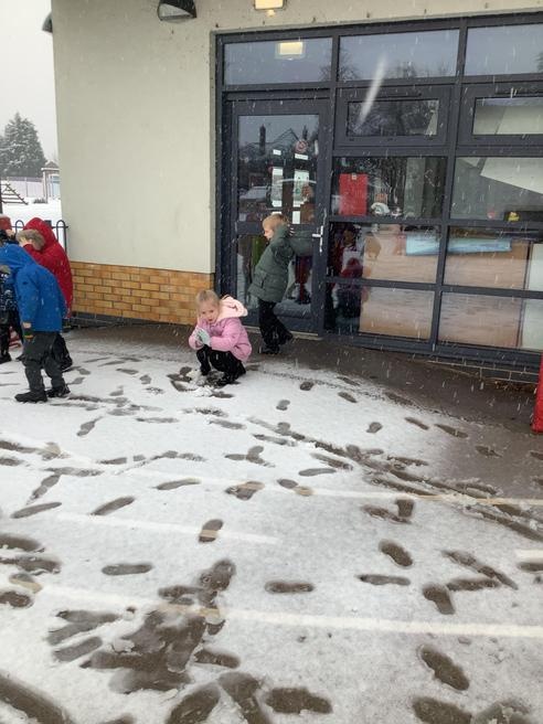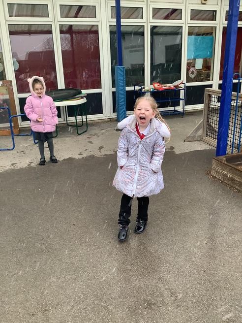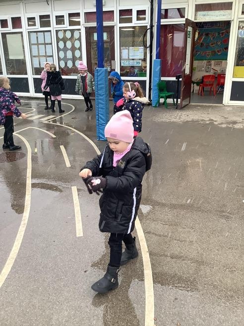 We have been keen weather watchers today as the weather changed from sleet in the morning to snow, we experienced both. We tried to catch snowflakes with our hands and on our tongues. We even threw some snowballs at Mrs Cross and Mrs Abson. We enjoyed the show very much and we are hoping for some more snow so we can build some snowmen.