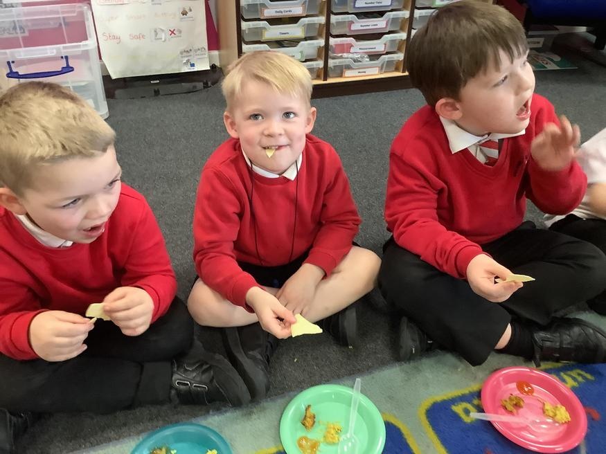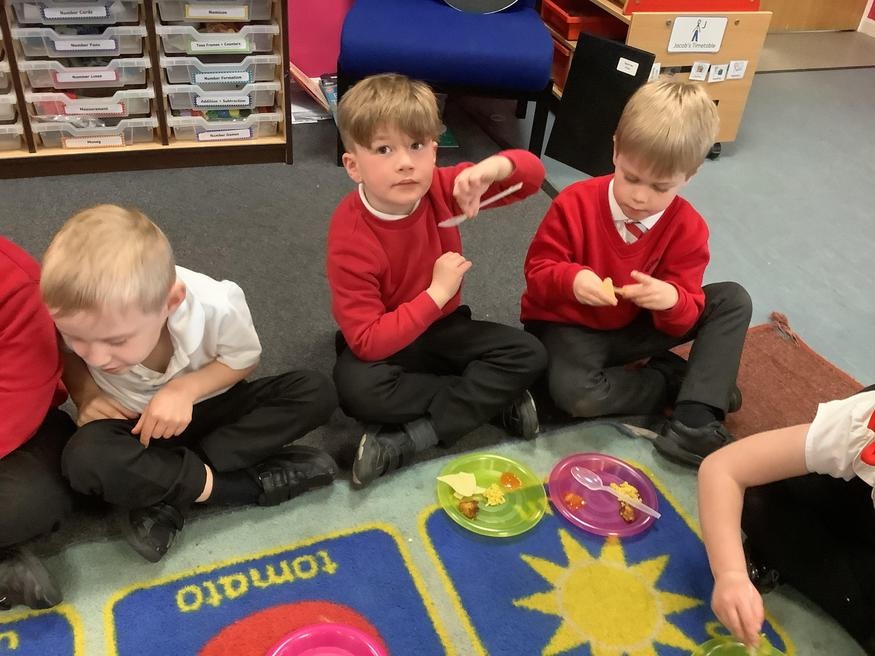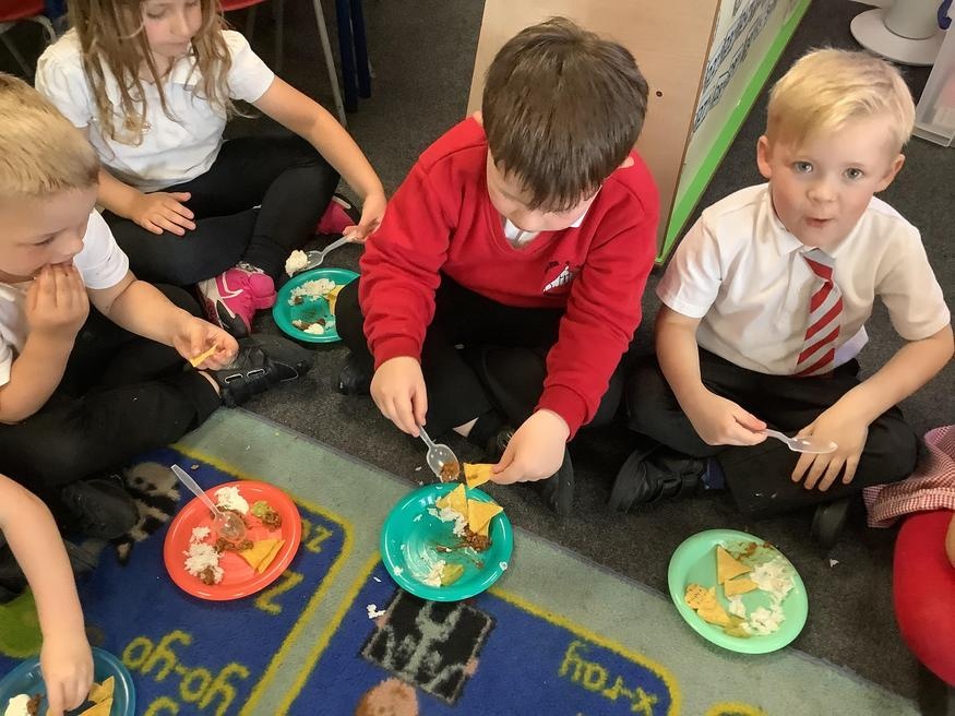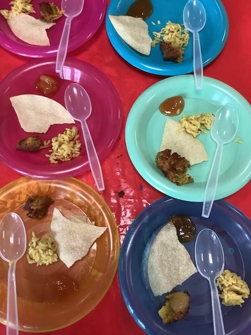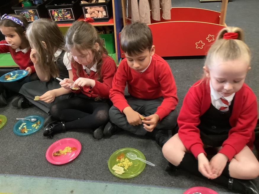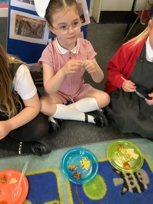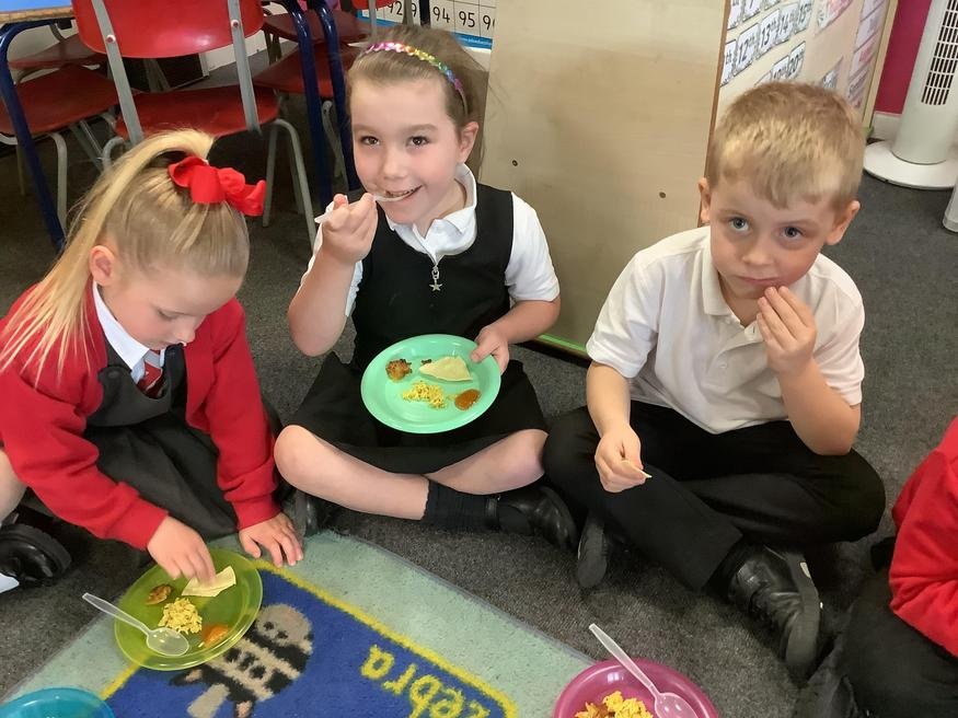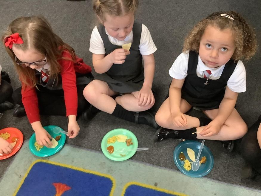 We looked at the different foods you might see, and found out if any of us have experienced them before. We looked at the food we had today - Popadoms, Onion Bahji’s, Pilau Rice and Mango Chutney.
