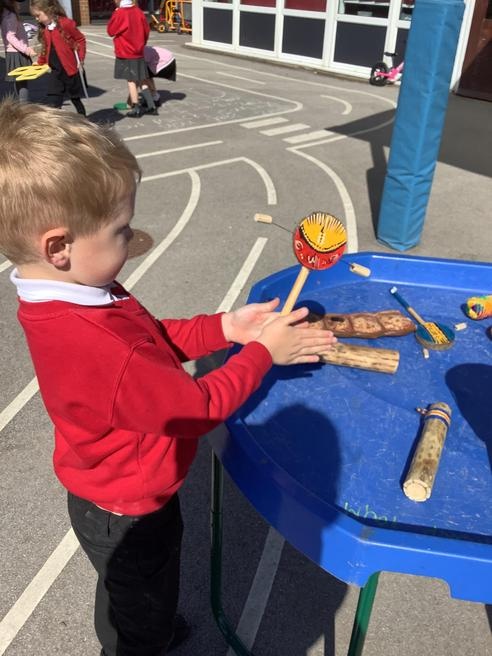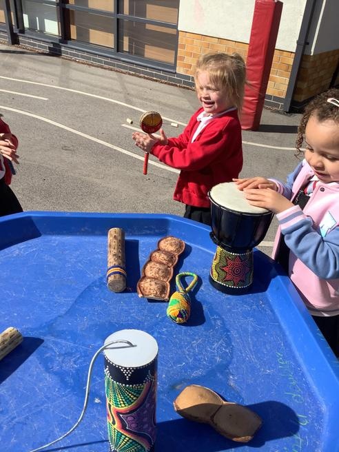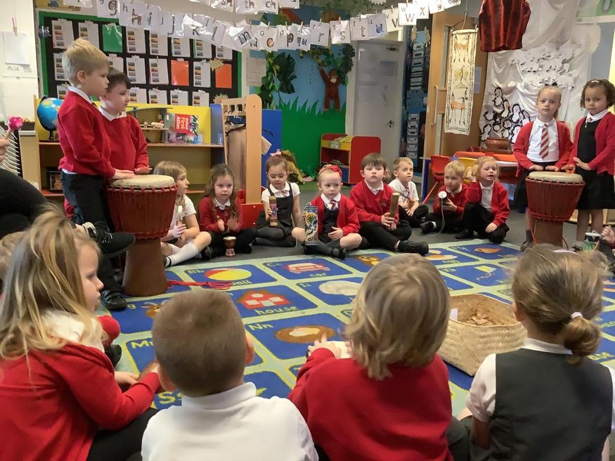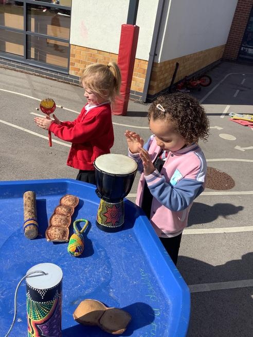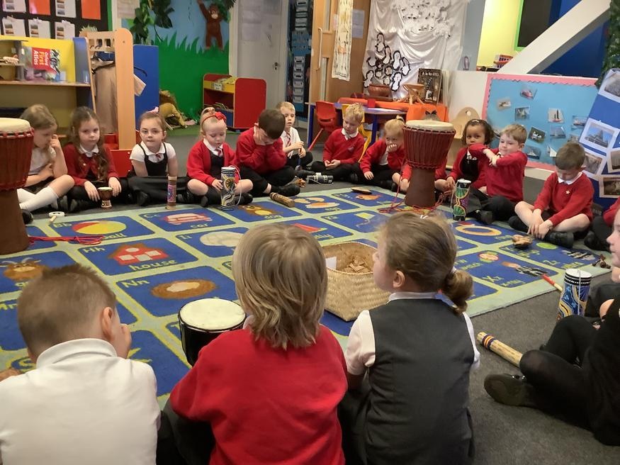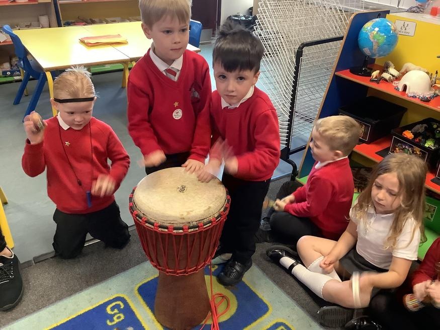 We explored African instruments such as the djembe drum, man-clack, monkey ladder, cactus stick and monkey drums! We had a go exploring the different sounds they made and how they looked and felt.