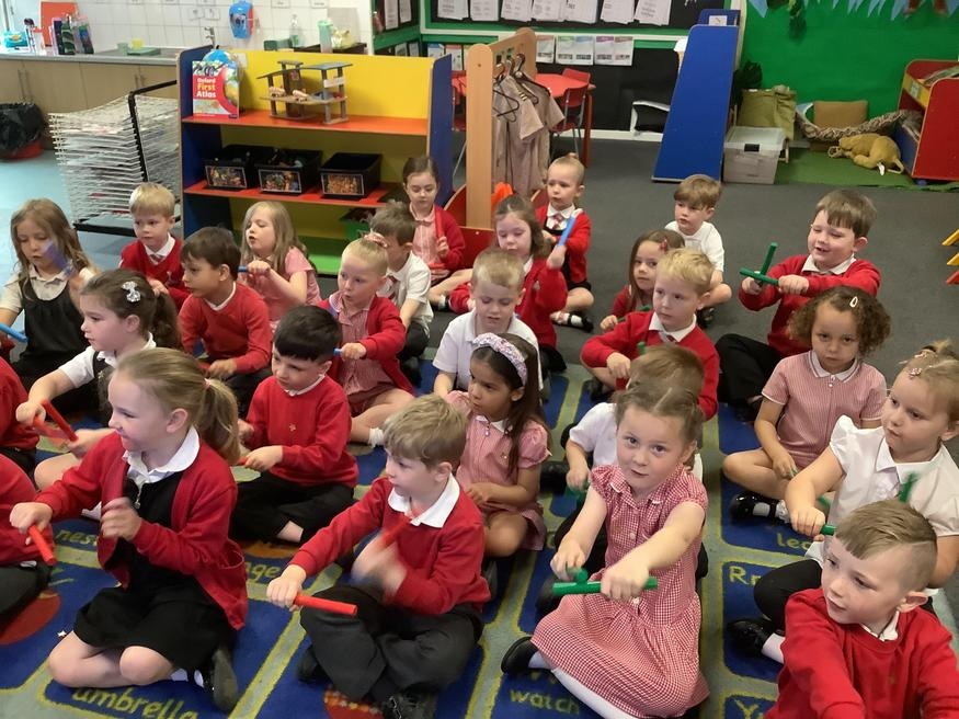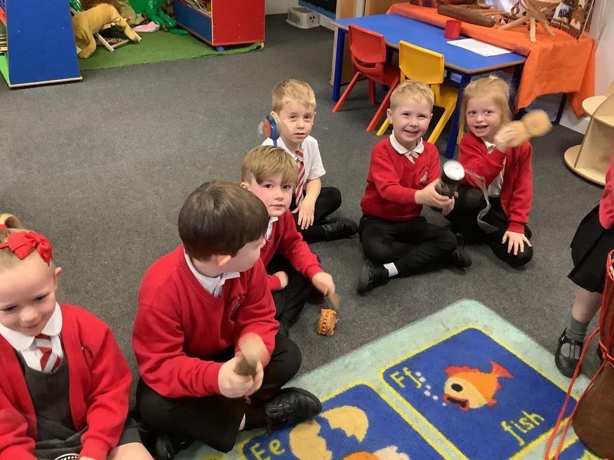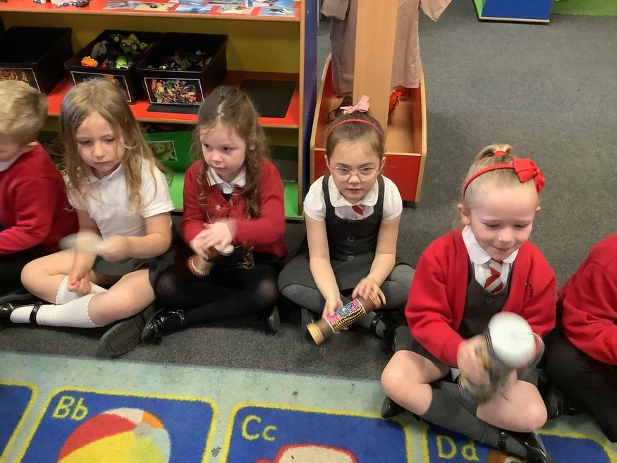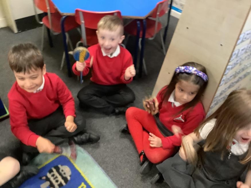 We listened to a piece of music called “grasslands” and then practised playing quieter and louder alongside the music. This meant we had to listen carefully and use our instruments in different ways. We also tried to keep to the beat, not going to fast or slow, but it was a bit tricky!