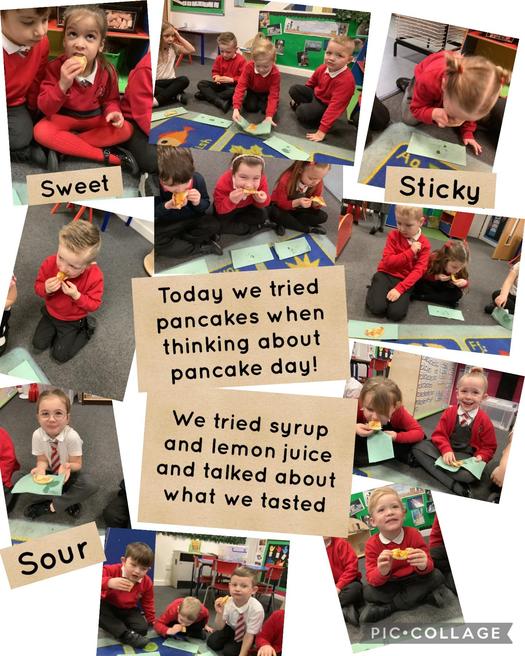 We tried different toppings - syrup and lemon juice and talked about the difference between them. We thought about how the pancakes and the toppings felt, tasted, smelt and what we thought of them. Not all of us liked them!