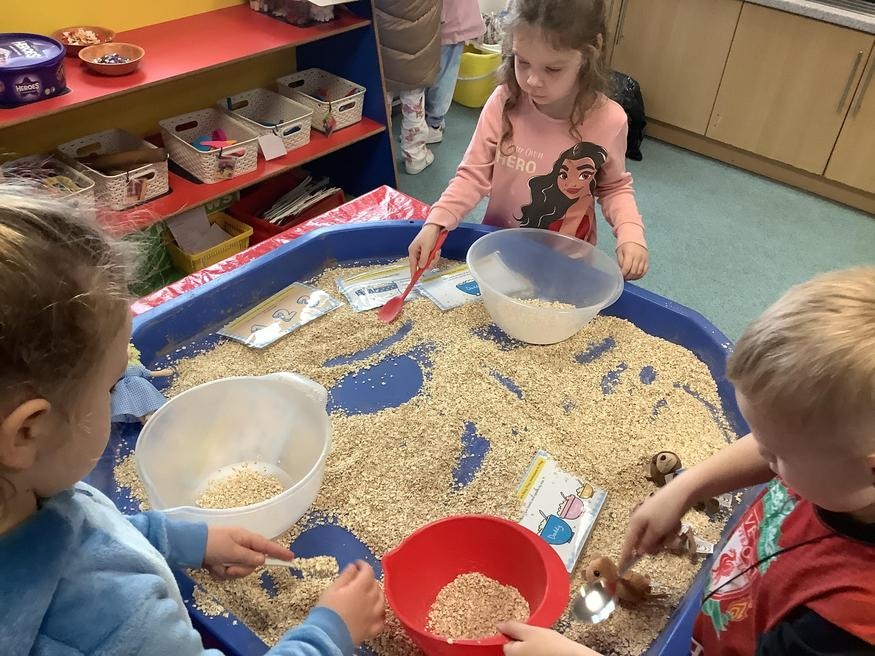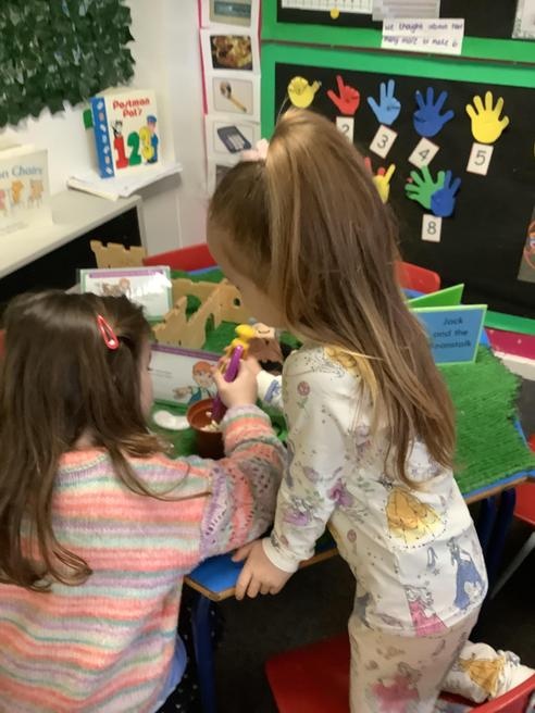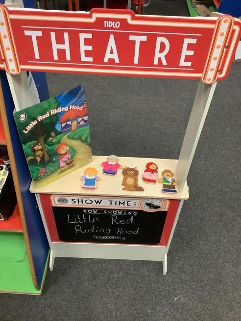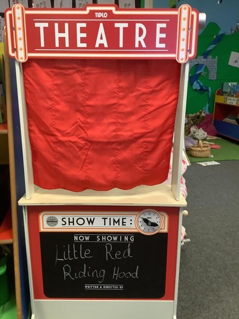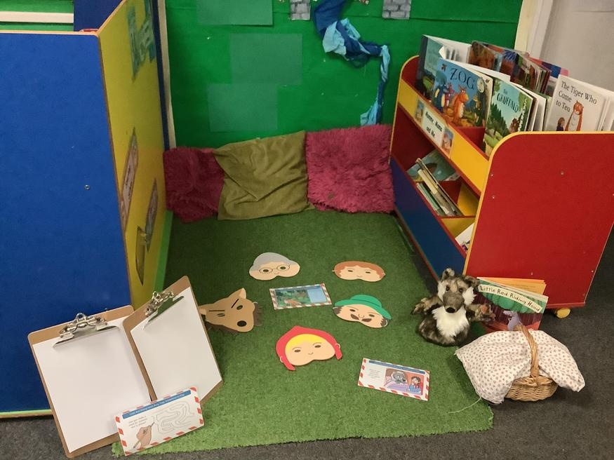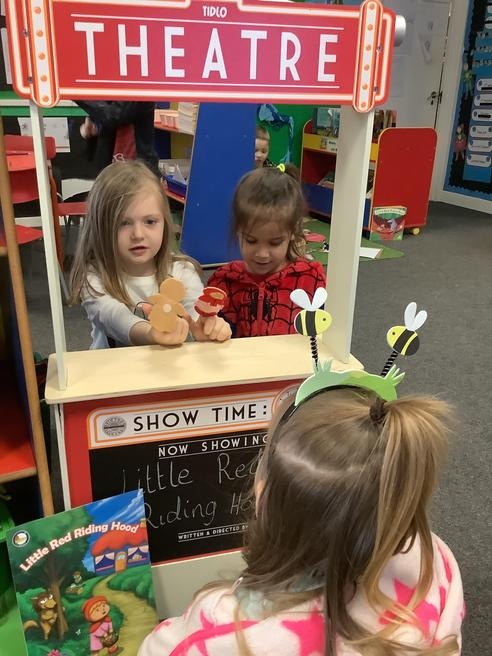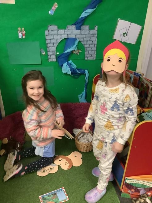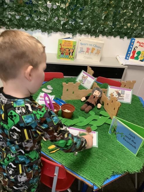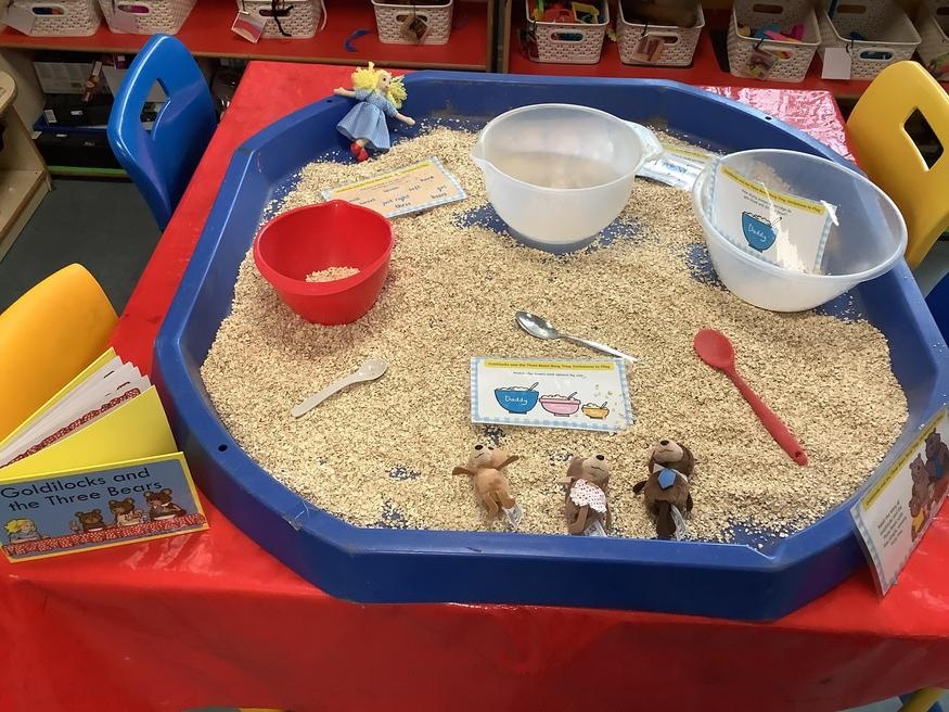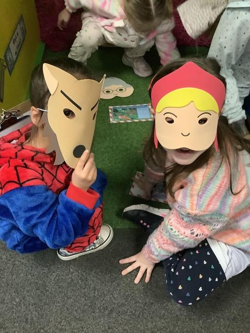 We took part in lots of different activities all surrounding some of out favourite texts. Inside we counted magic beans to match amounts with Jack and the Beanstalk, made porridge for the 3 bears whilst exploring capacity too, role played the little red riding hood, both with masks and in the puppet theatre!