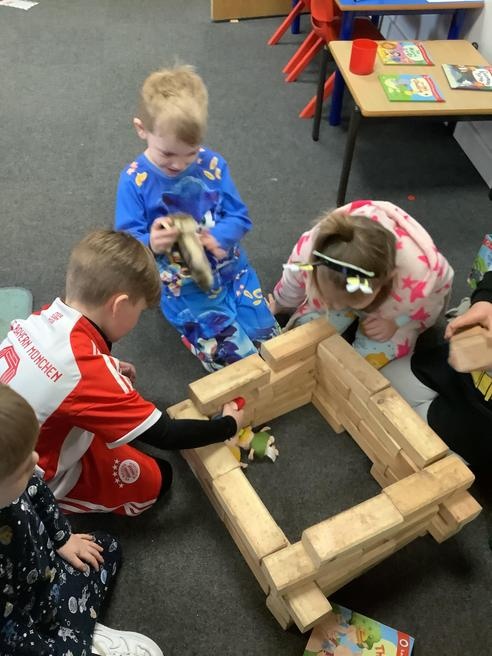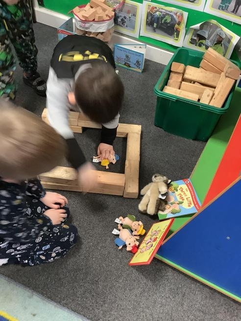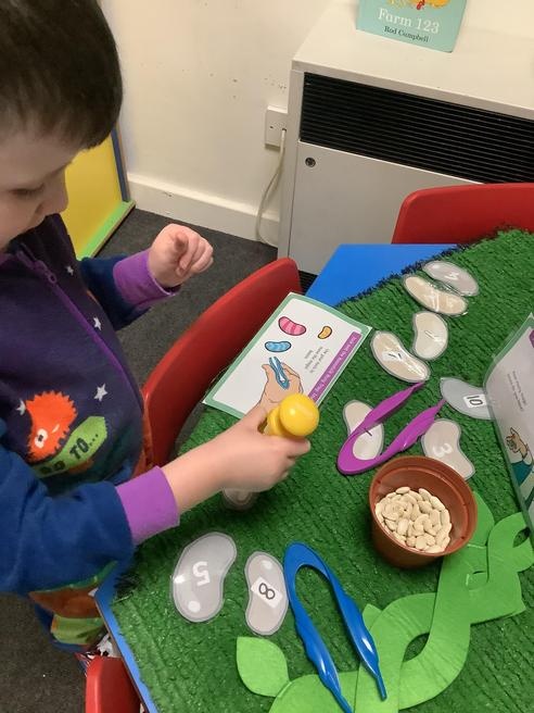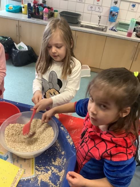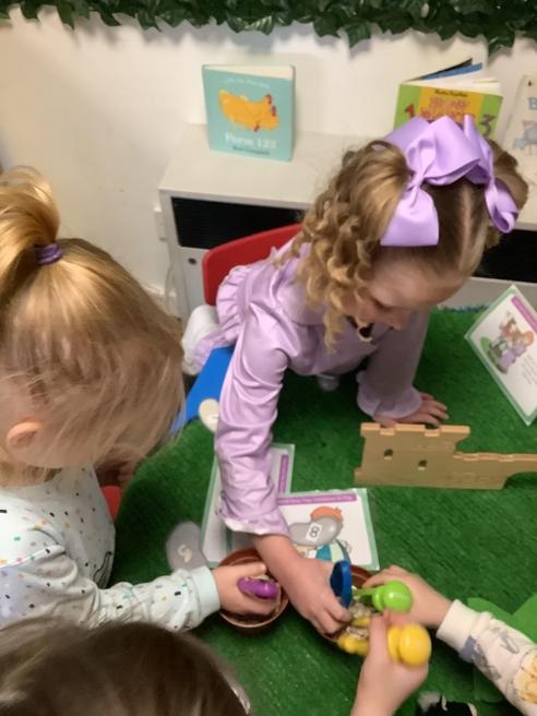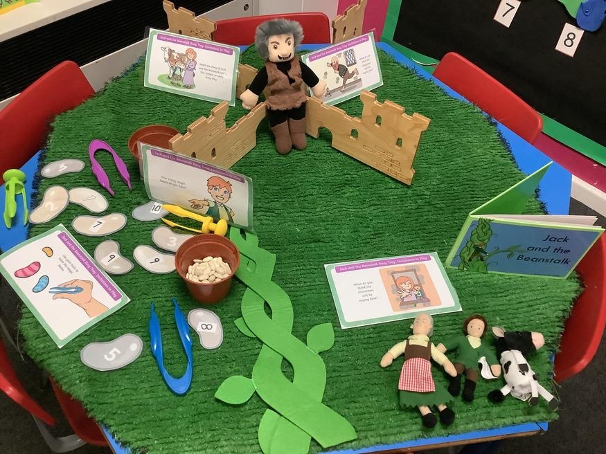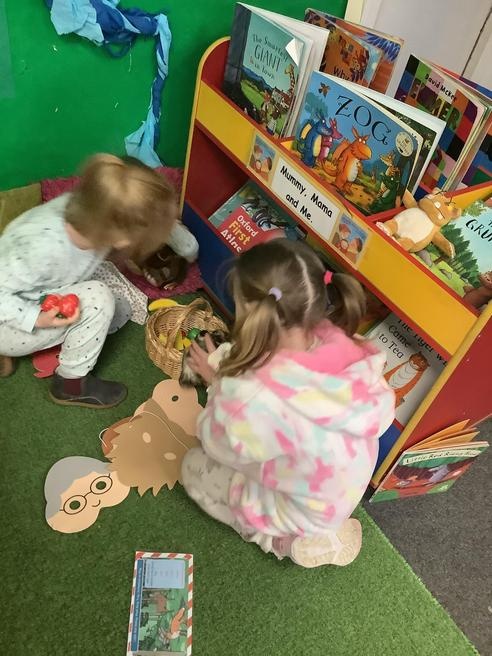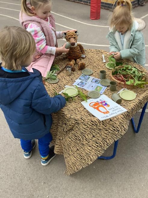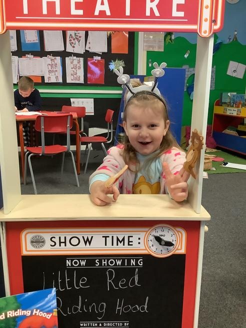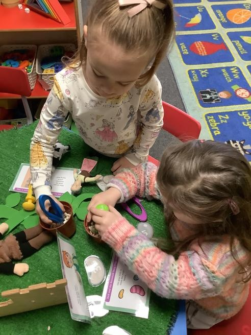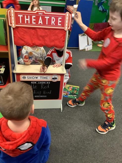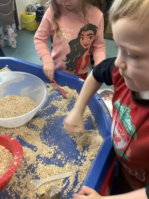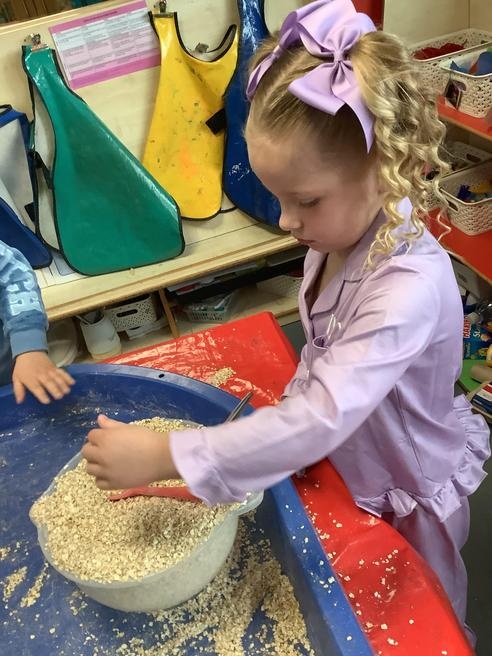 We took part in lots of different activities all surrounding some of out favourite texts. Inside we counted magic beans to match amounts with Jack and the Beanstalk, made porridge for the 3 bears whilst exploring capacity too, role played the little red riding hood, both with masks and in the puppet theatre!