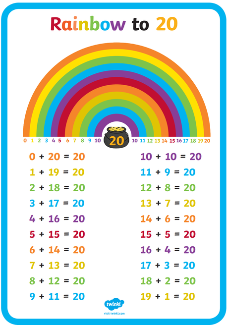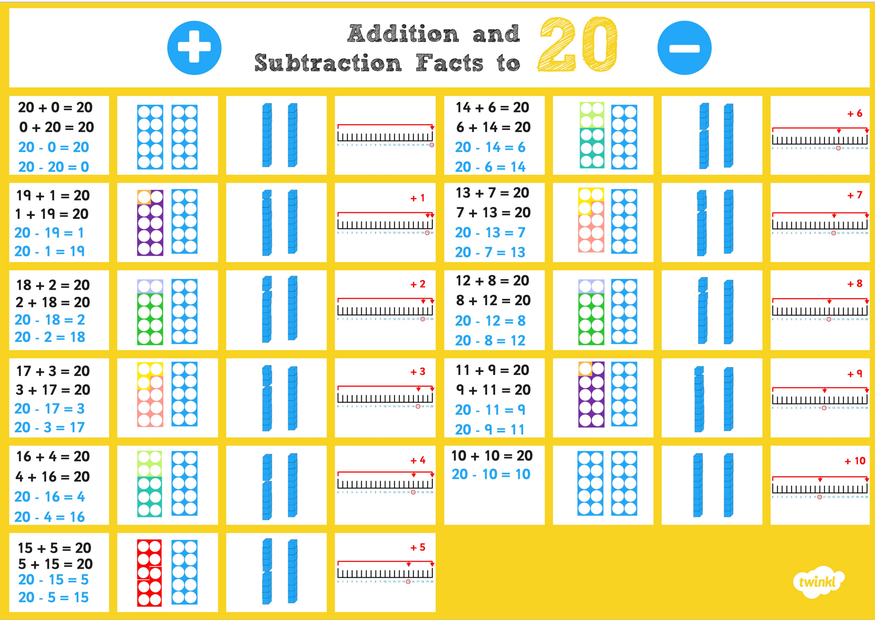 In Year 1, children learn how to add and subtract number facts up to 20, becoming familiar with all the different combinations, such as: 1+9=10, 14+3=17, 16+4=20, etc.