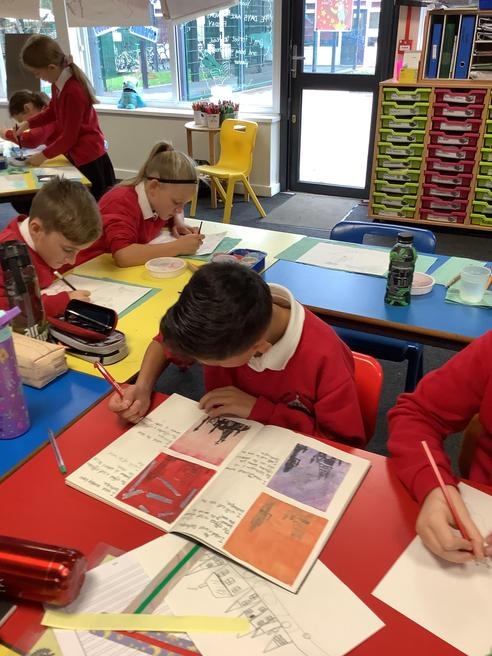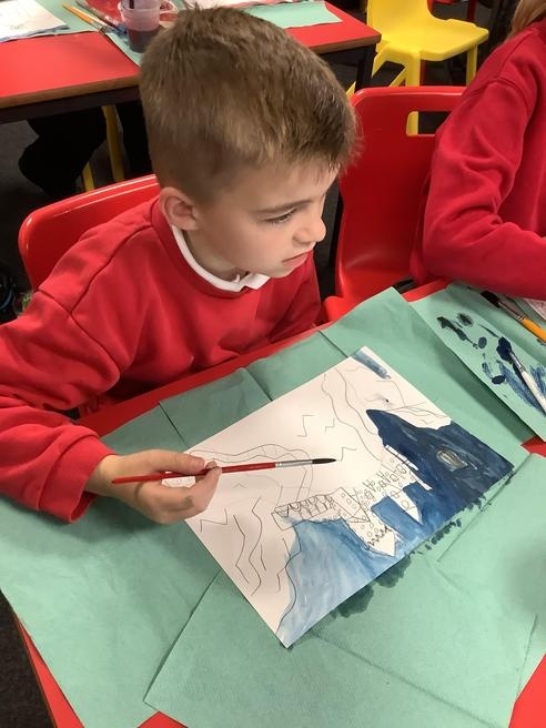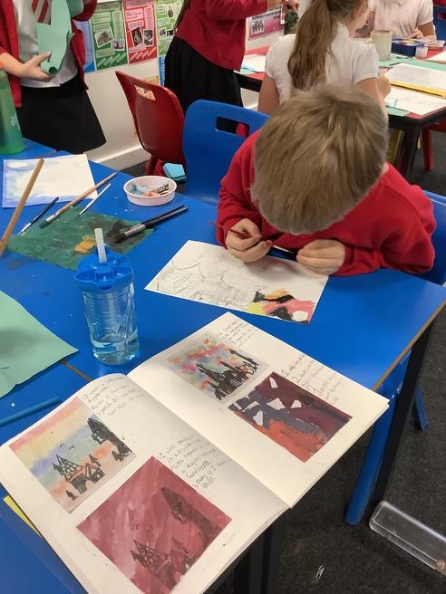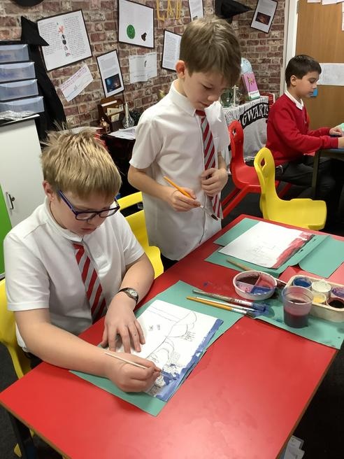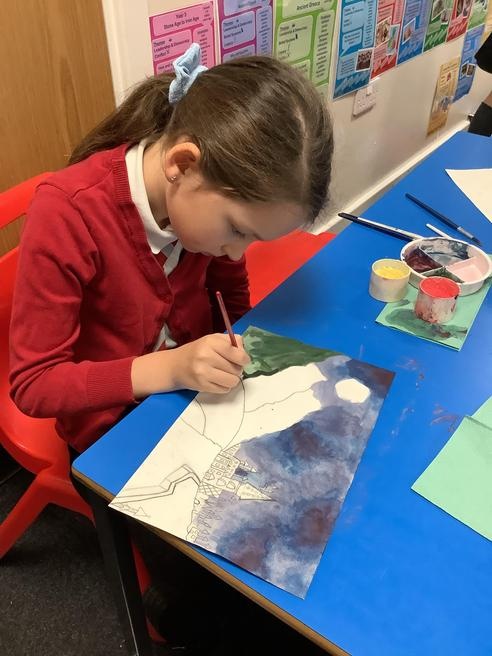 In our art unit we have been experimenting with the properties of different paints. We have used masking techniques and wax resist. Our inspiration has been the image of Hogwarts in the distance.