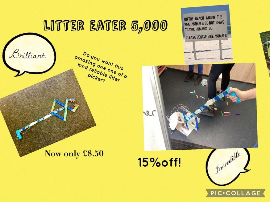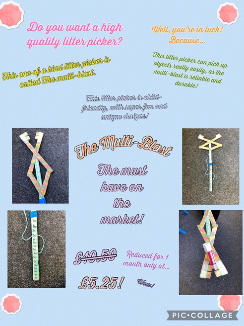 The children have worked really hard in groups creating their litter pickers. They have researched different types of litter pickers, surveyed the Y5 pupils about what they would like from a litter picker as well as creating prototypes before completing their final versions.